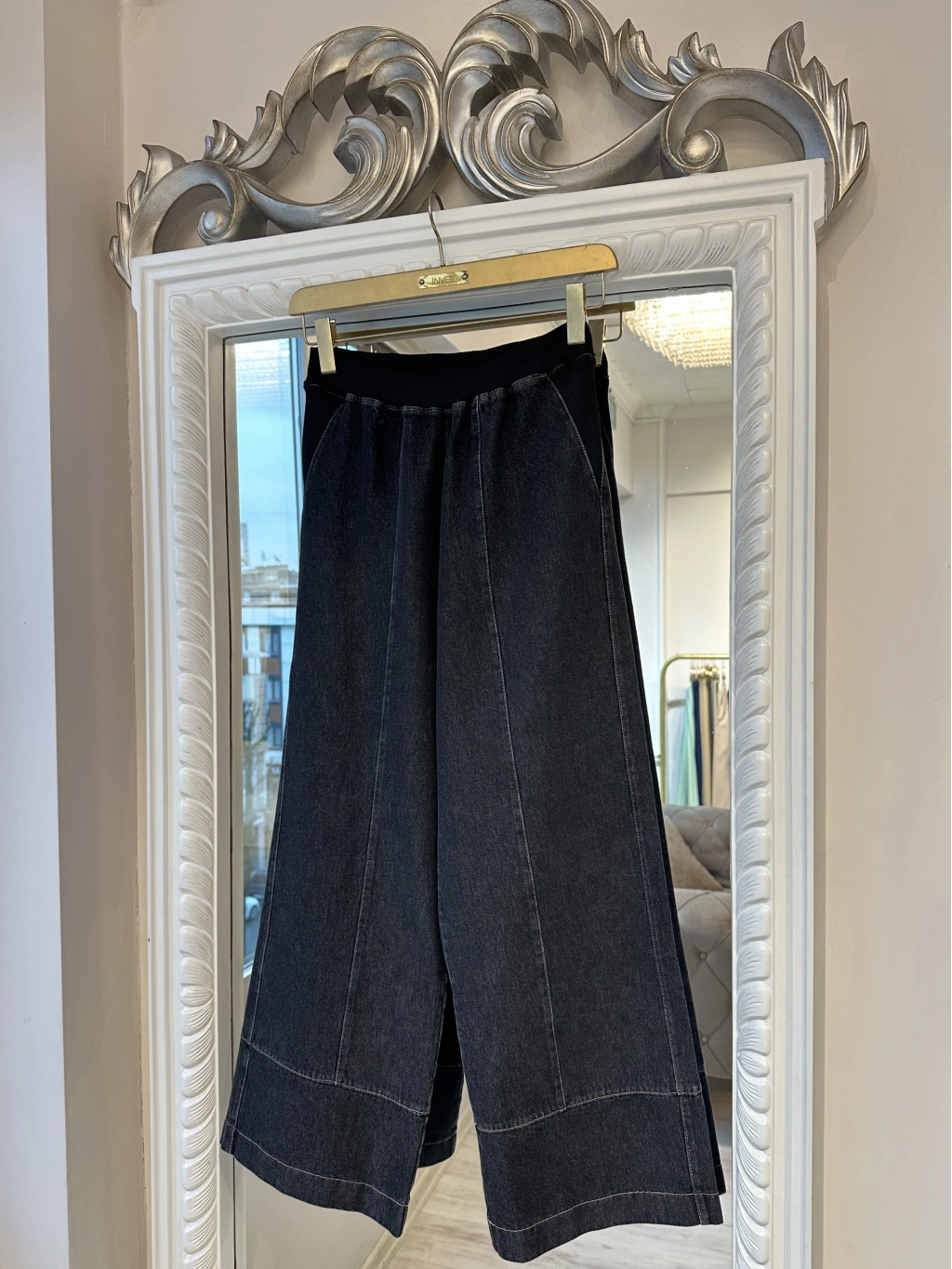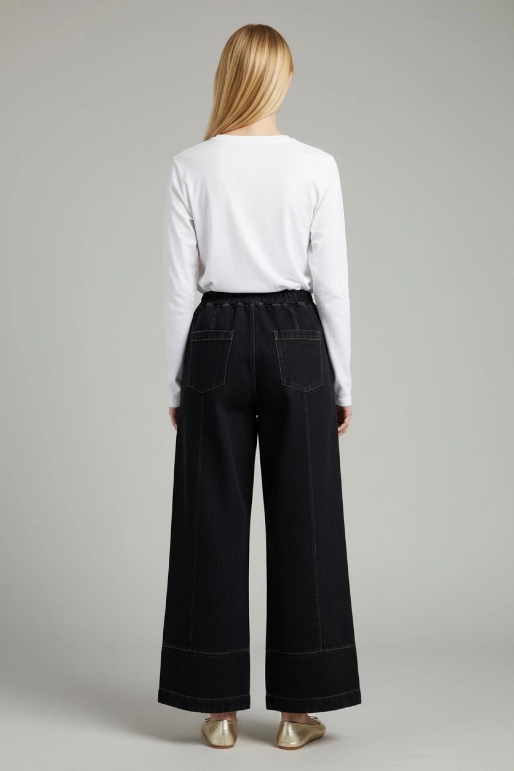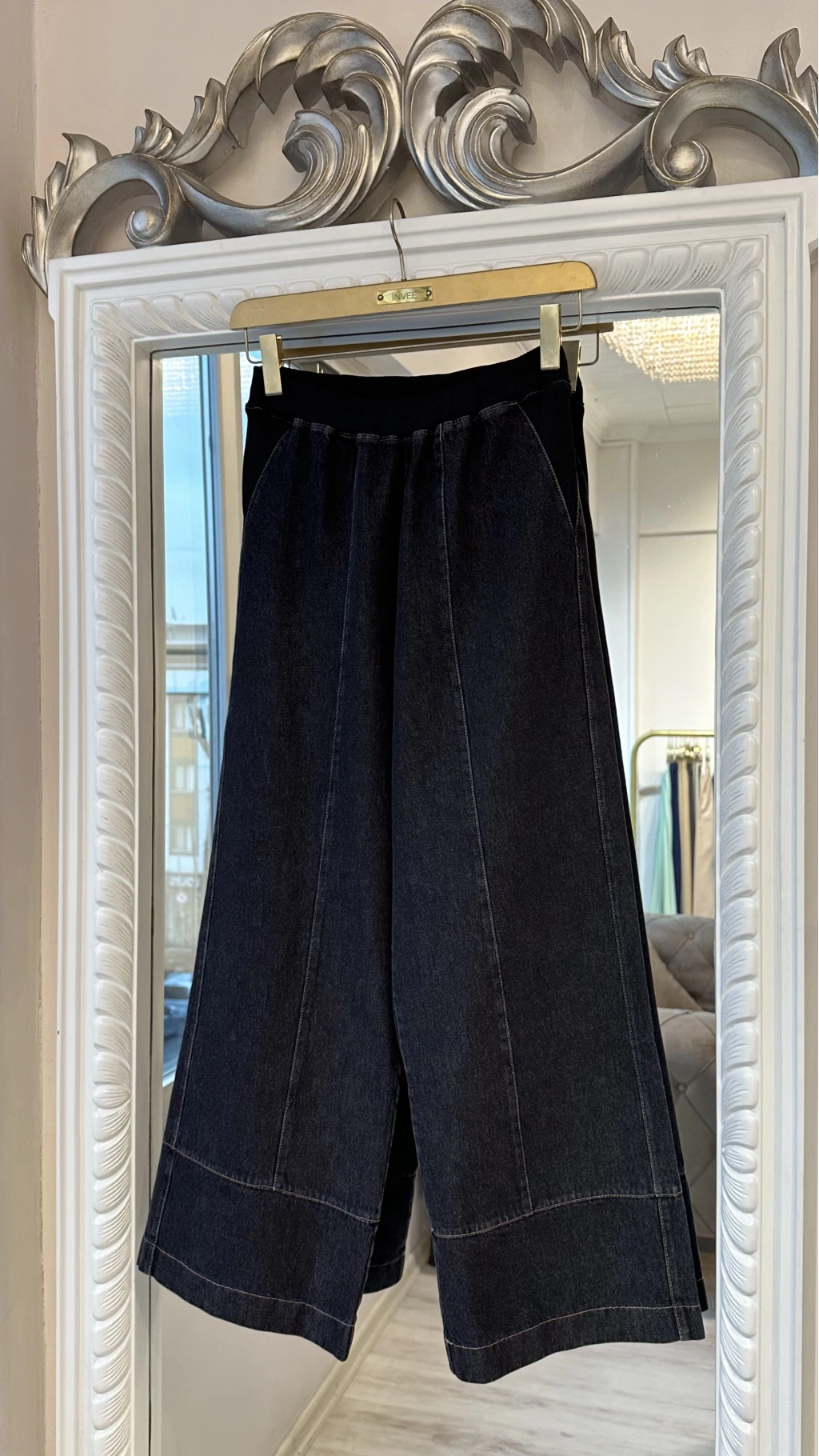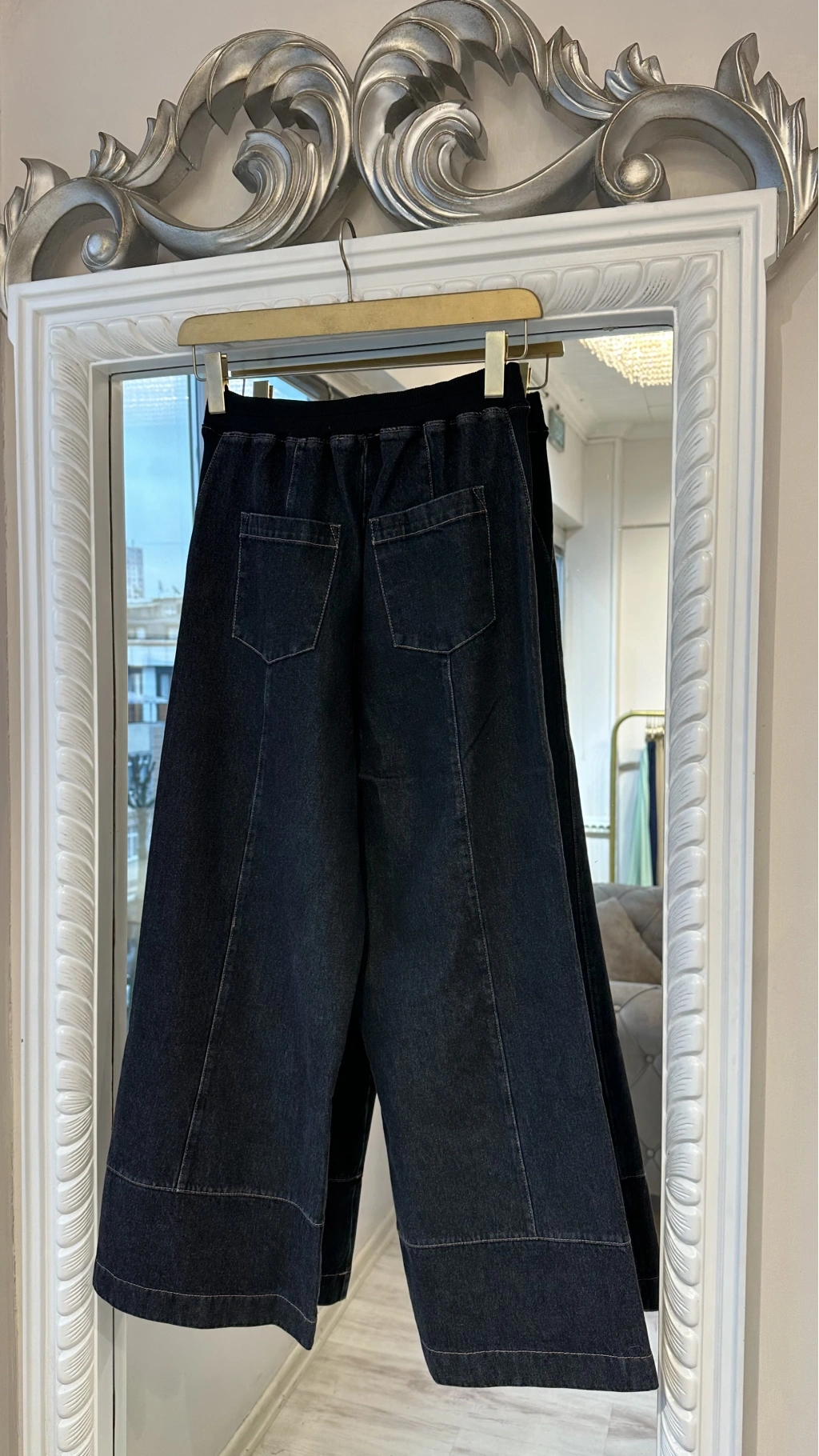 Günlük kombinlerde maksimum rahatlık sunan denim bol paça kadın pantolon.