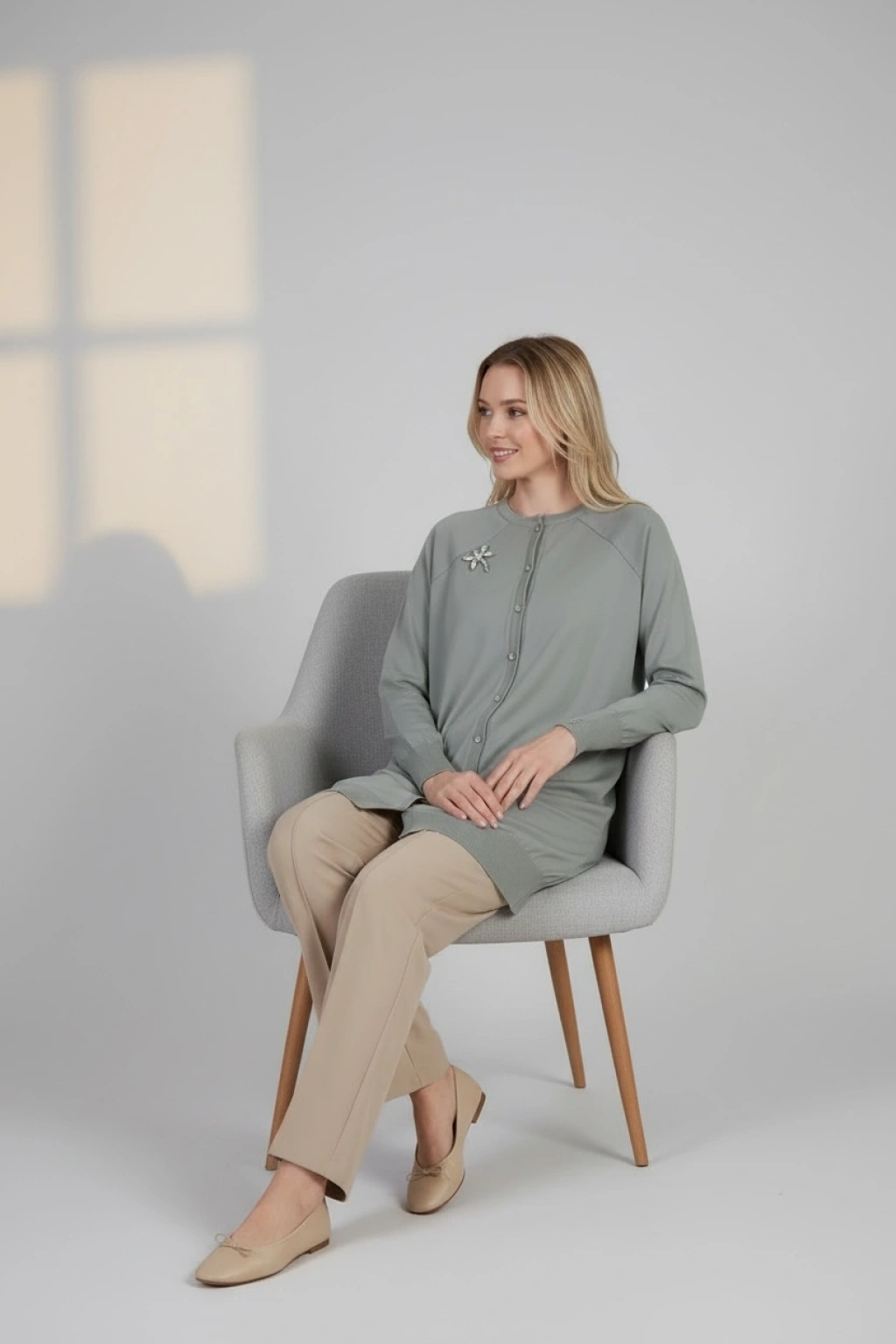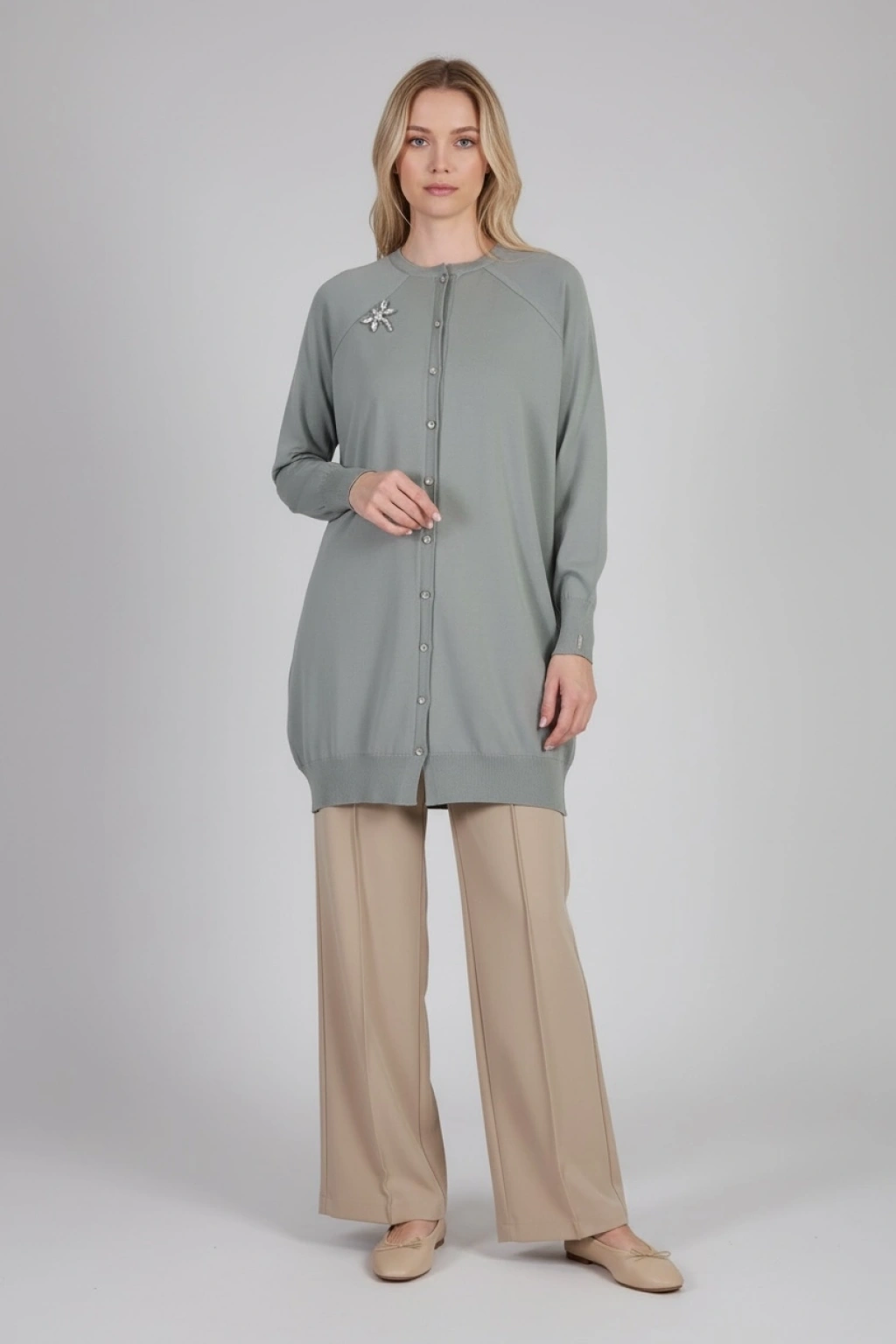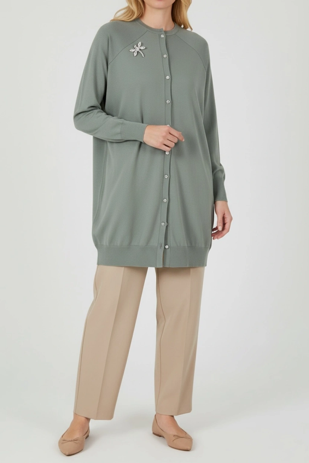 Üzerindeki yusufçuk broşu ve taş düğmeleri,