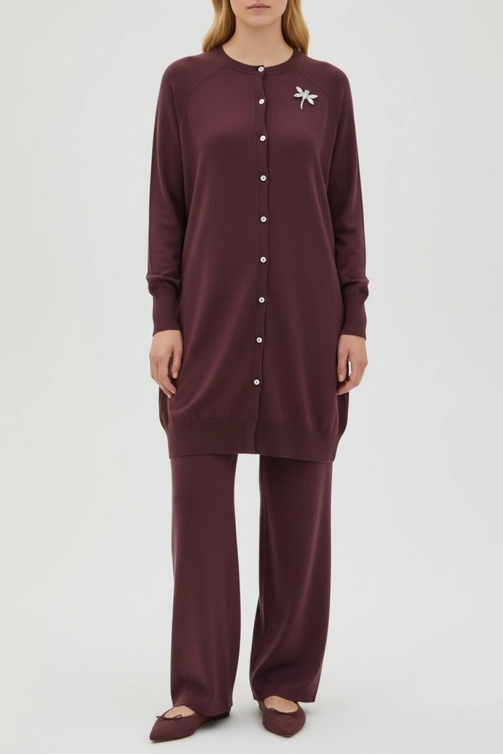 Üzerindeki yusufçuk broşu ve taş düğmeleri,