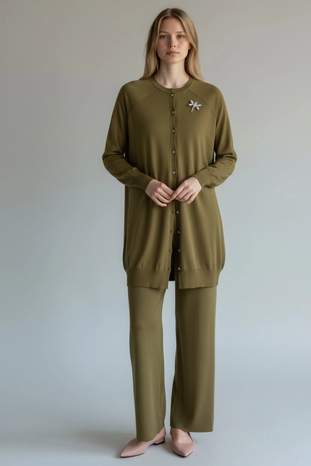 Üzerindeki yusufçuk broşu ve taş düğmeleri,