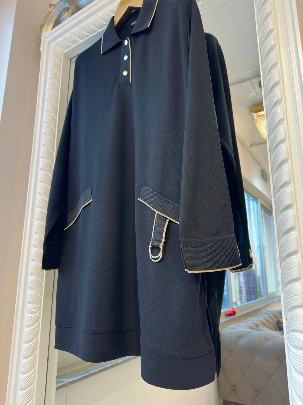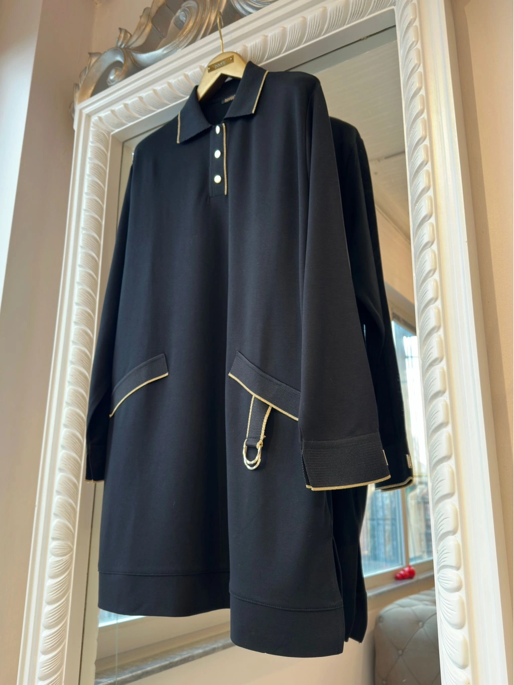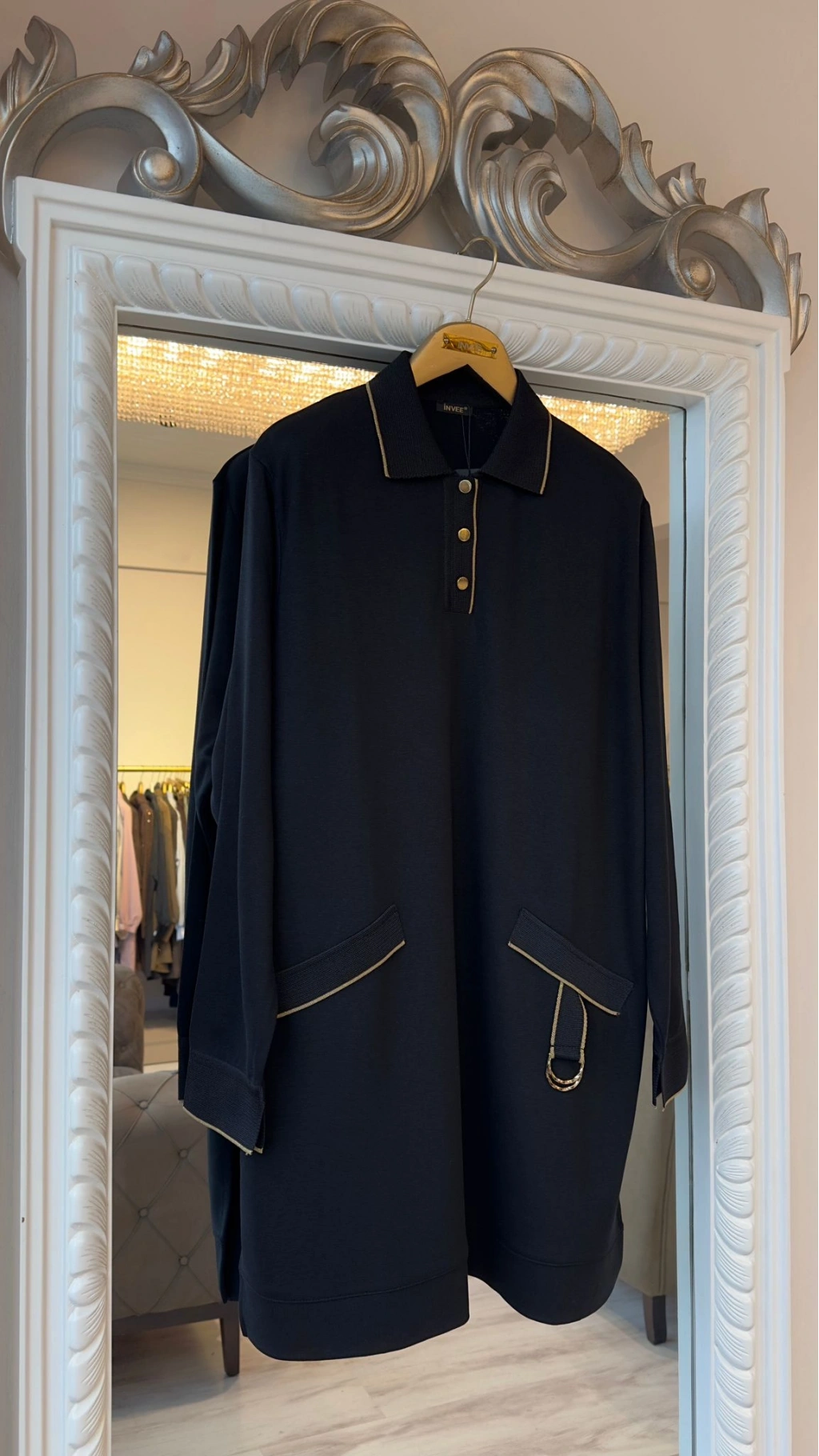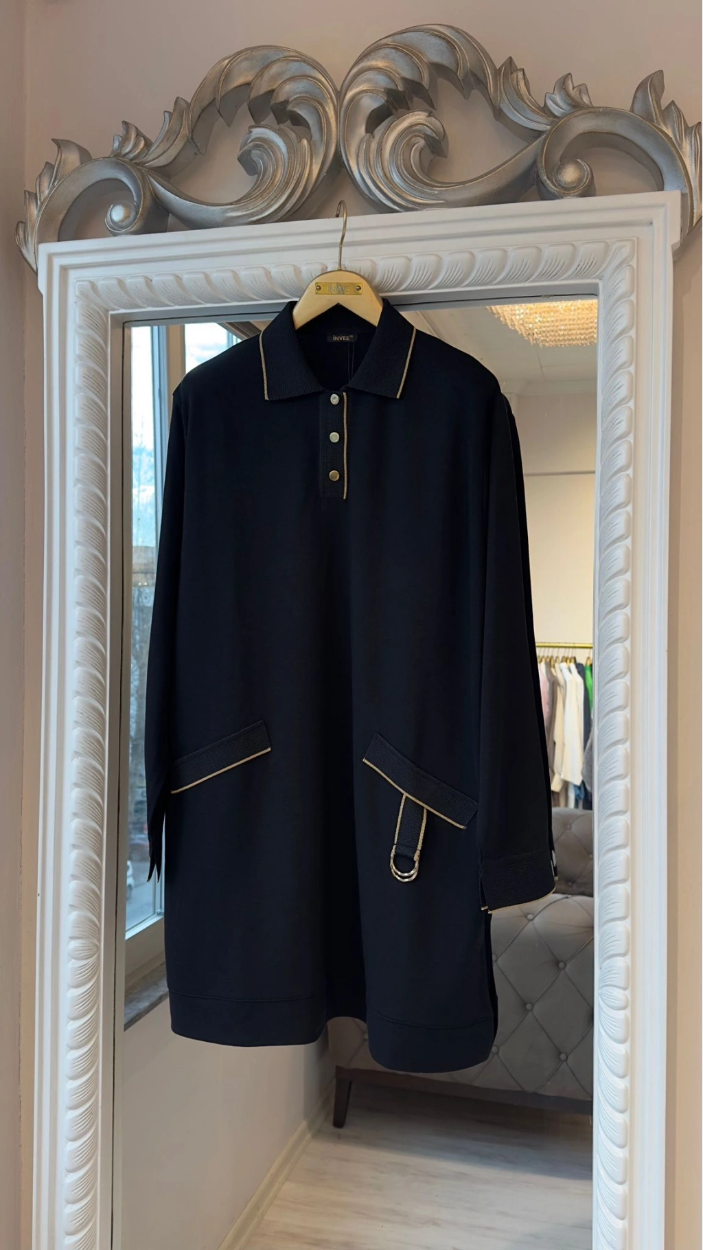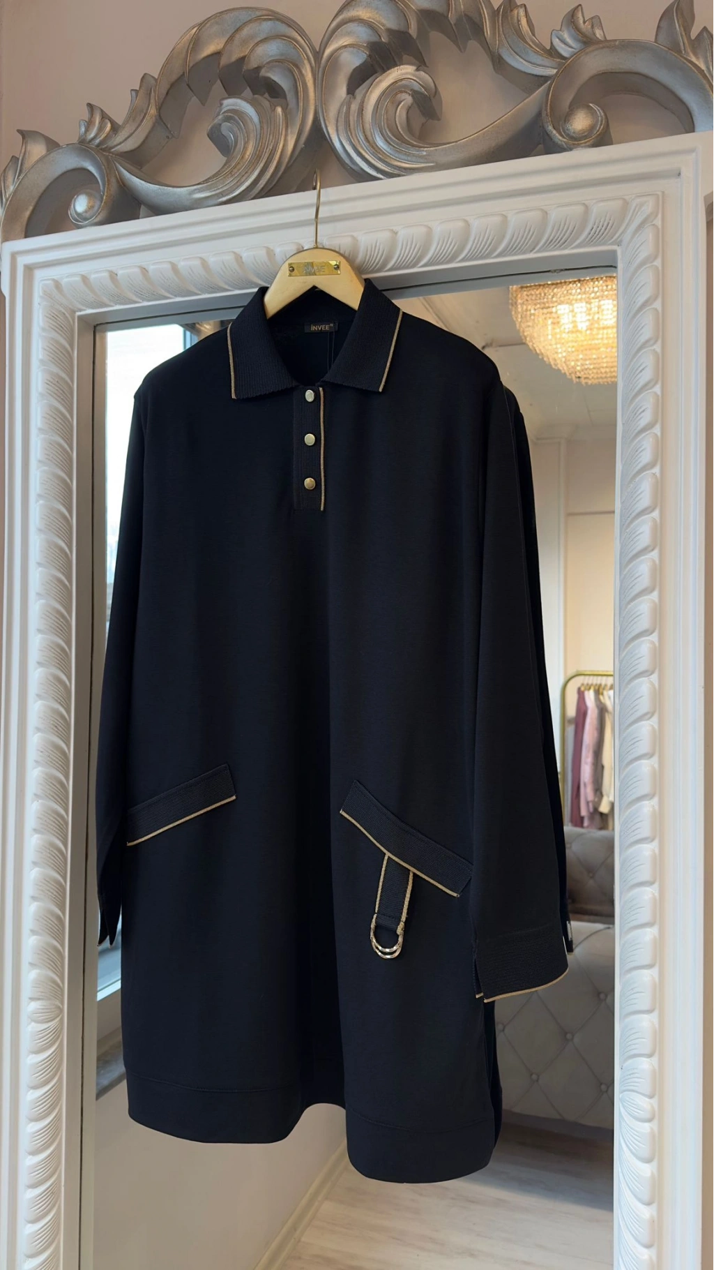 Zarif duruşu ve modern detaylarıyla öne çıkan bu tunik, sade şıklığı sevenler için tasarlandı. Polo yaka formu ve düğme detayları klasik bir görünüm sunarken, cep üzerindeki metal aksesuar ve biyeli detaylar tasarıma sofistike bir dokunuş katar.