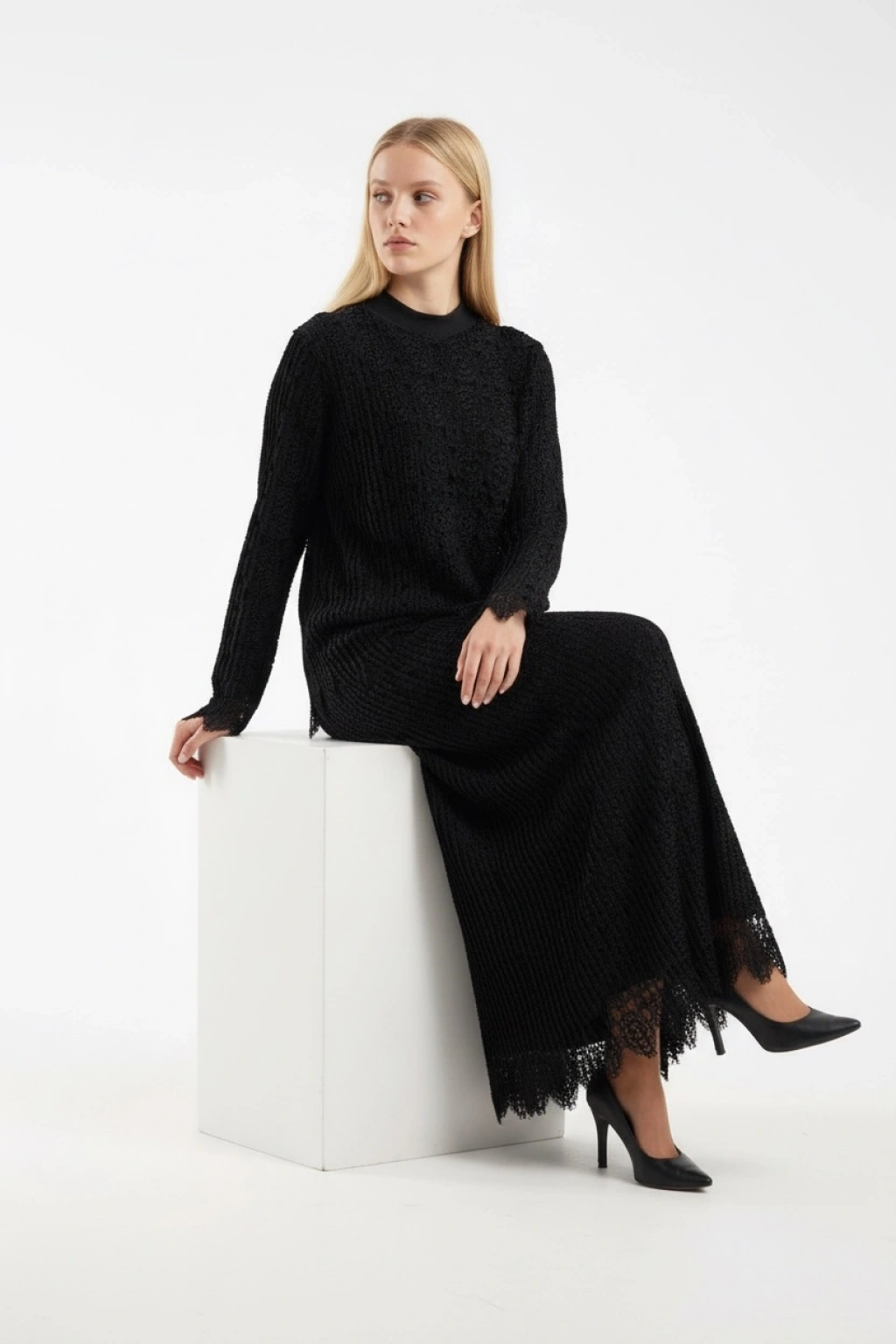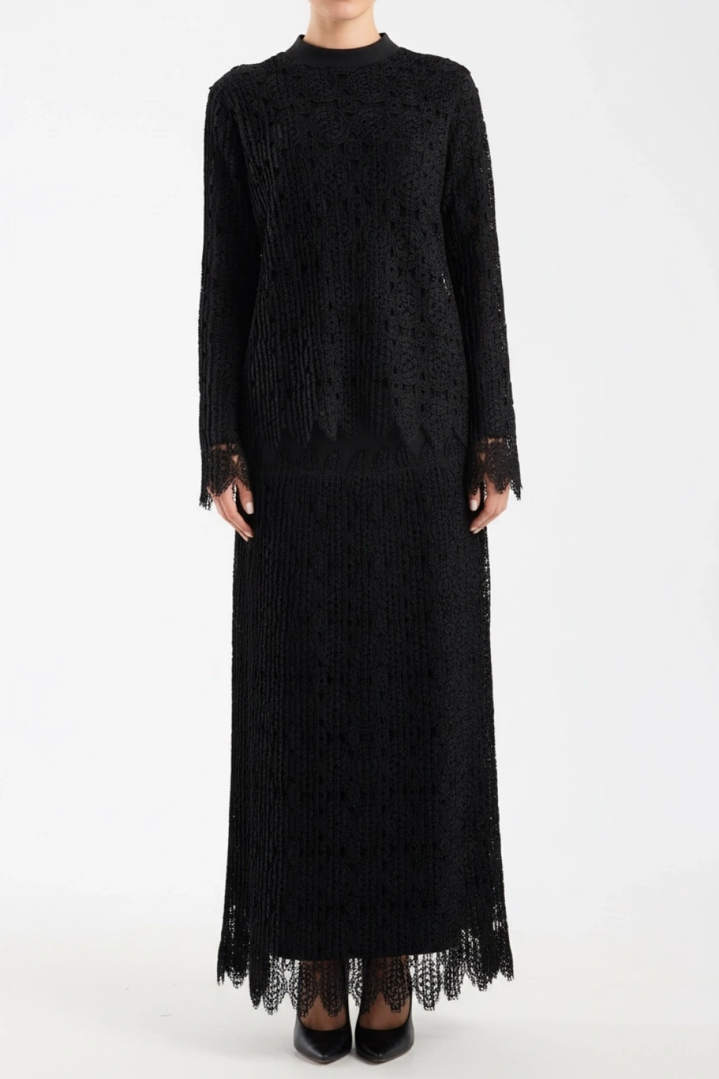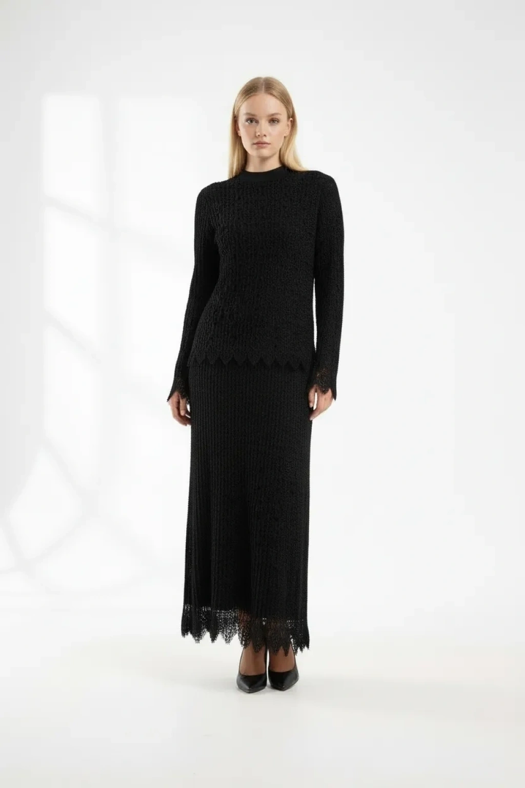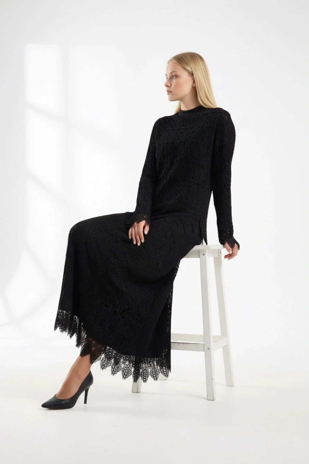 Zarif ve şık tasarımıyla öne çıkan siyah dantel takım, özel günlerde ve şık kombinlerde tercih edilebilecek modern bir tesettür takım modelidir. Üst kısmındaki dantel dokusu ve uzun etek formu ürüne elegan bir görünüm kazandırır.