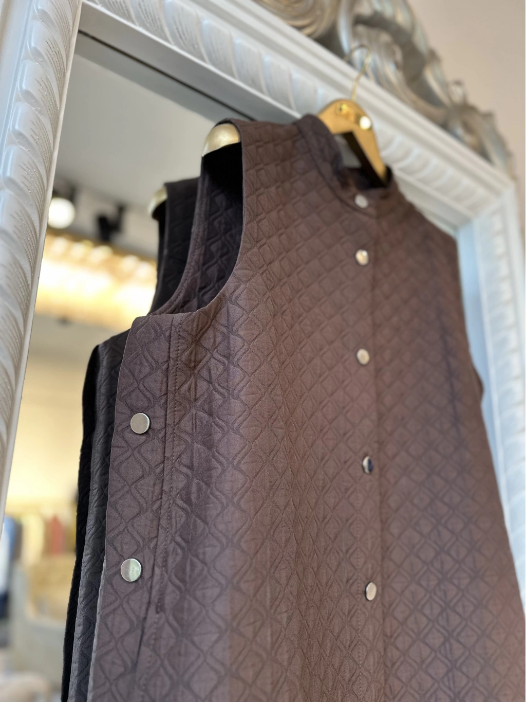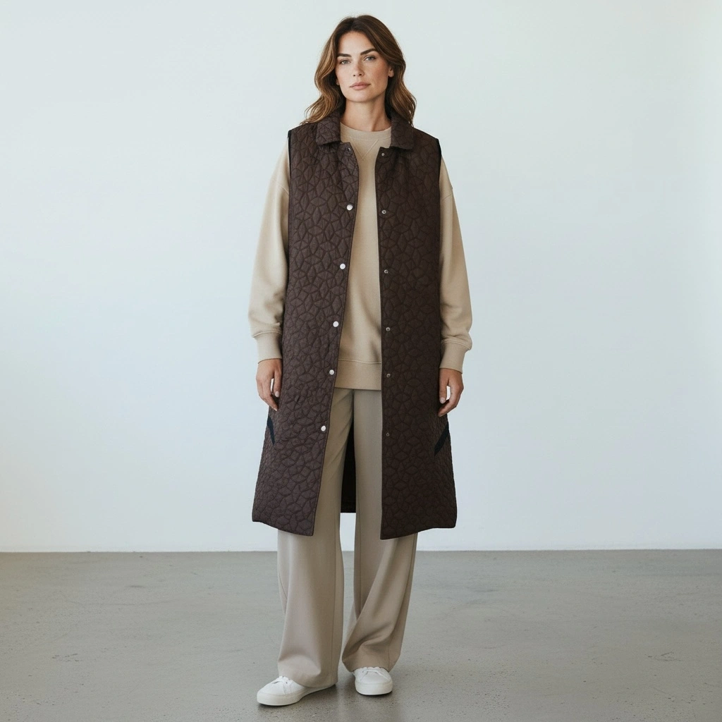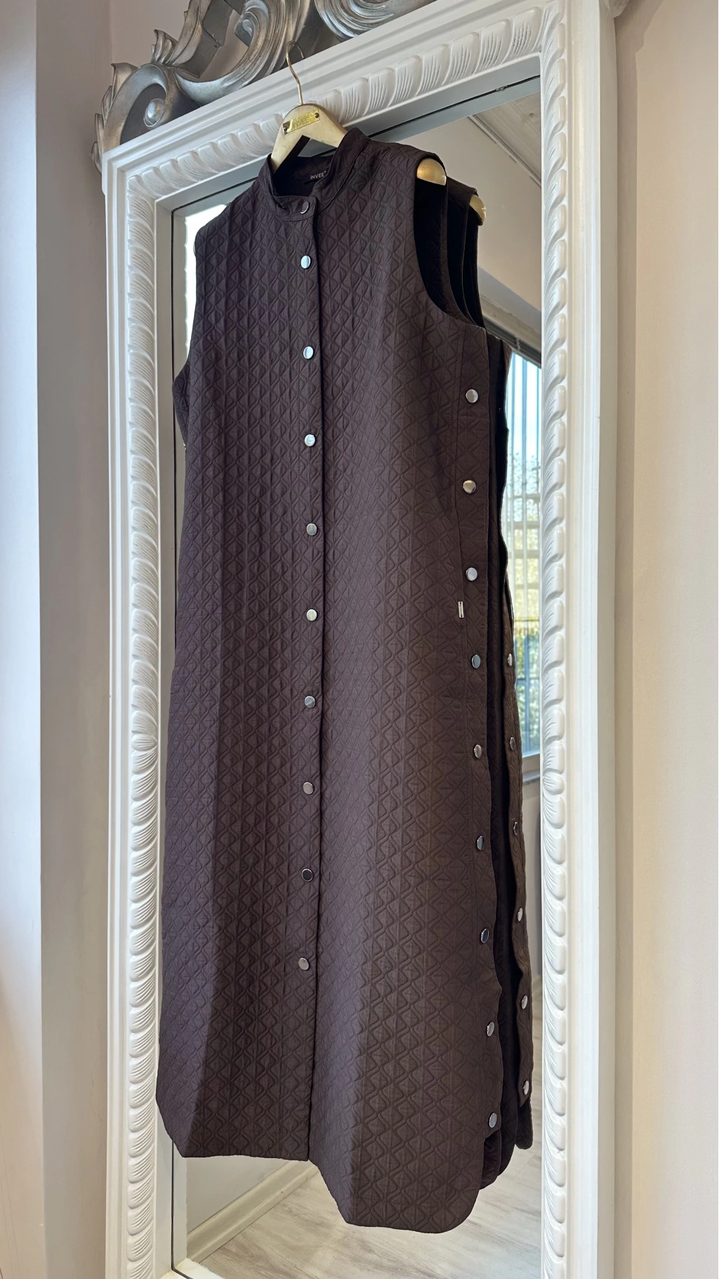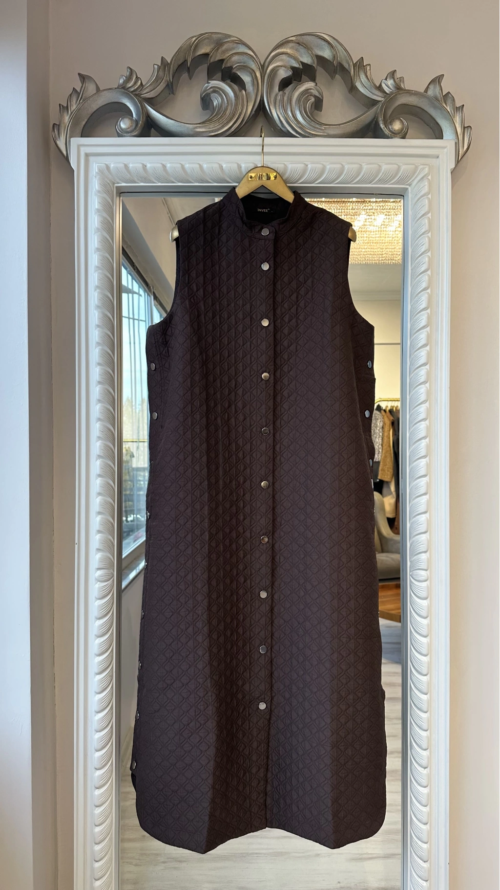 Zarif ve modern çizgileriyle öne çıkan bu kahverengi uzun yelek, minimal tasarımıyla her stile sofistike bir dokunuş katıyor. Kapitone dokusu ve metal düğme detayları sayesinde hem klasik hem de şehirli bir görünüm sunar.
