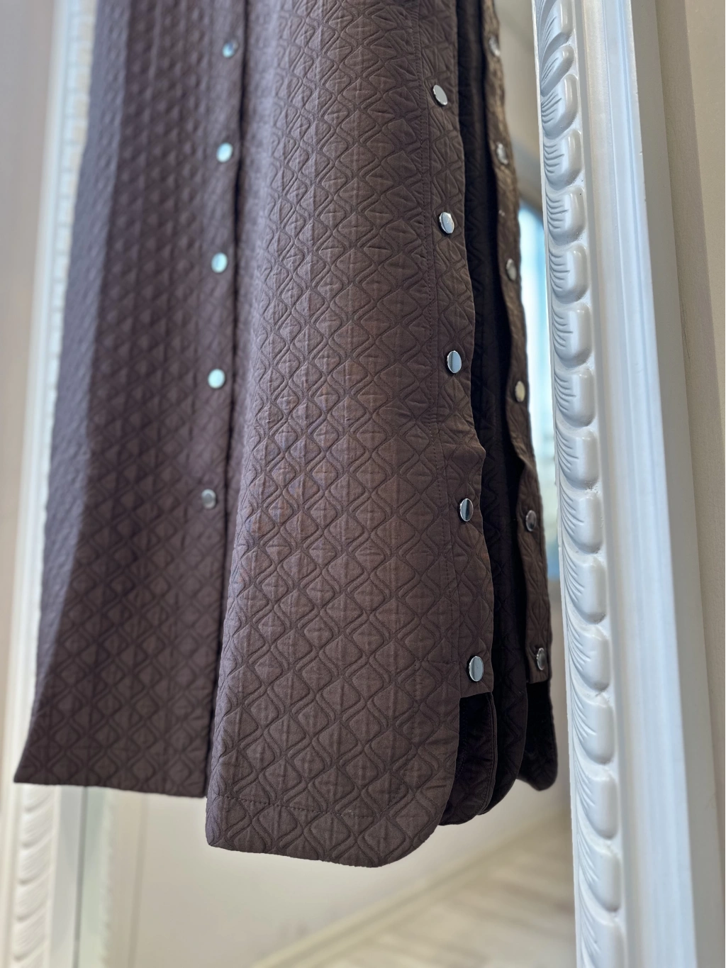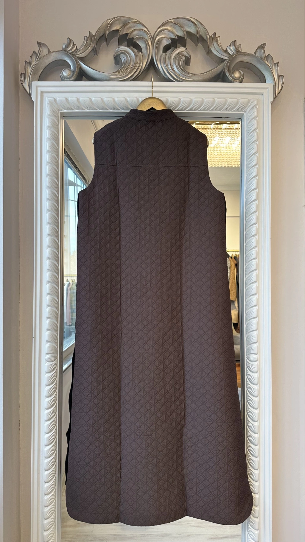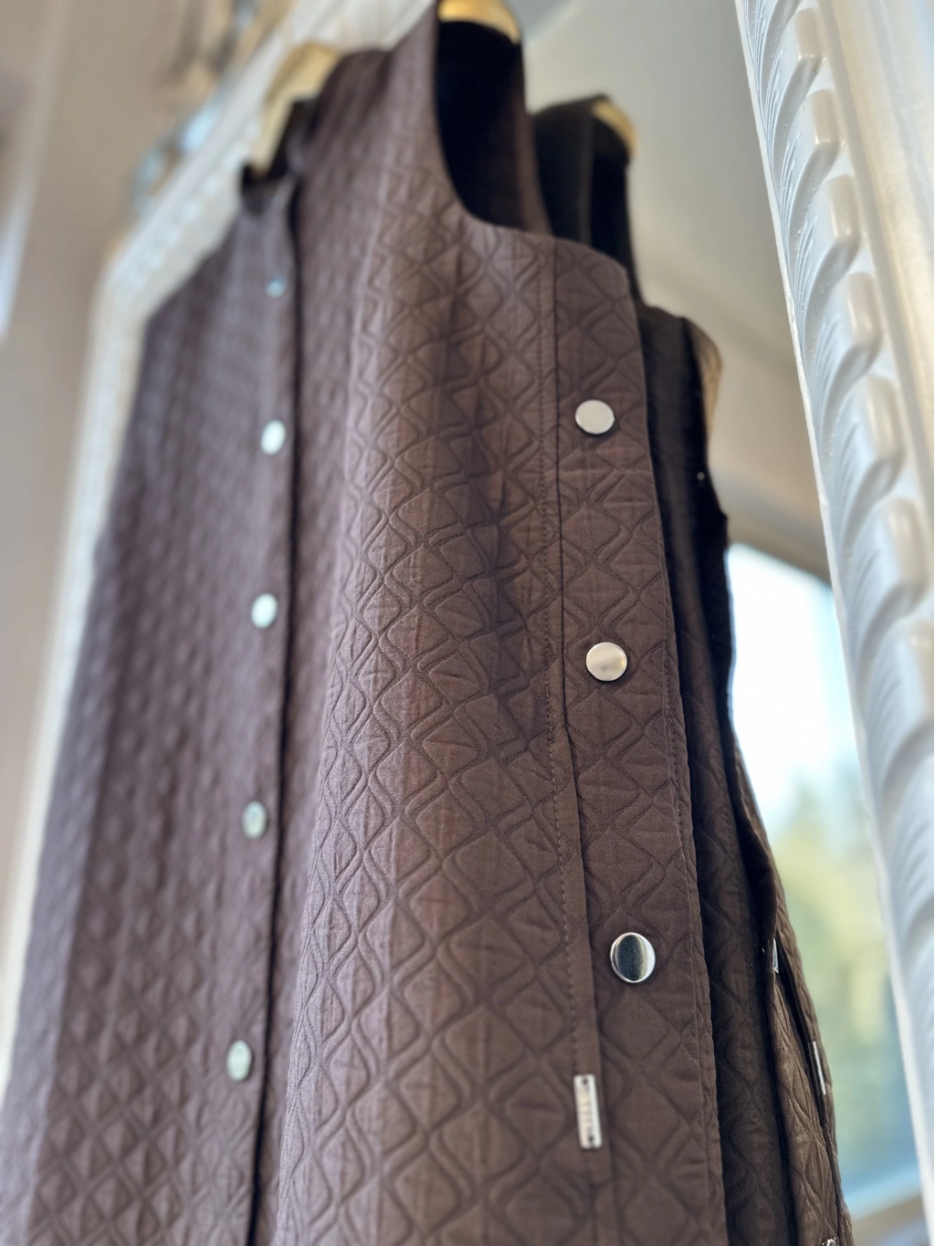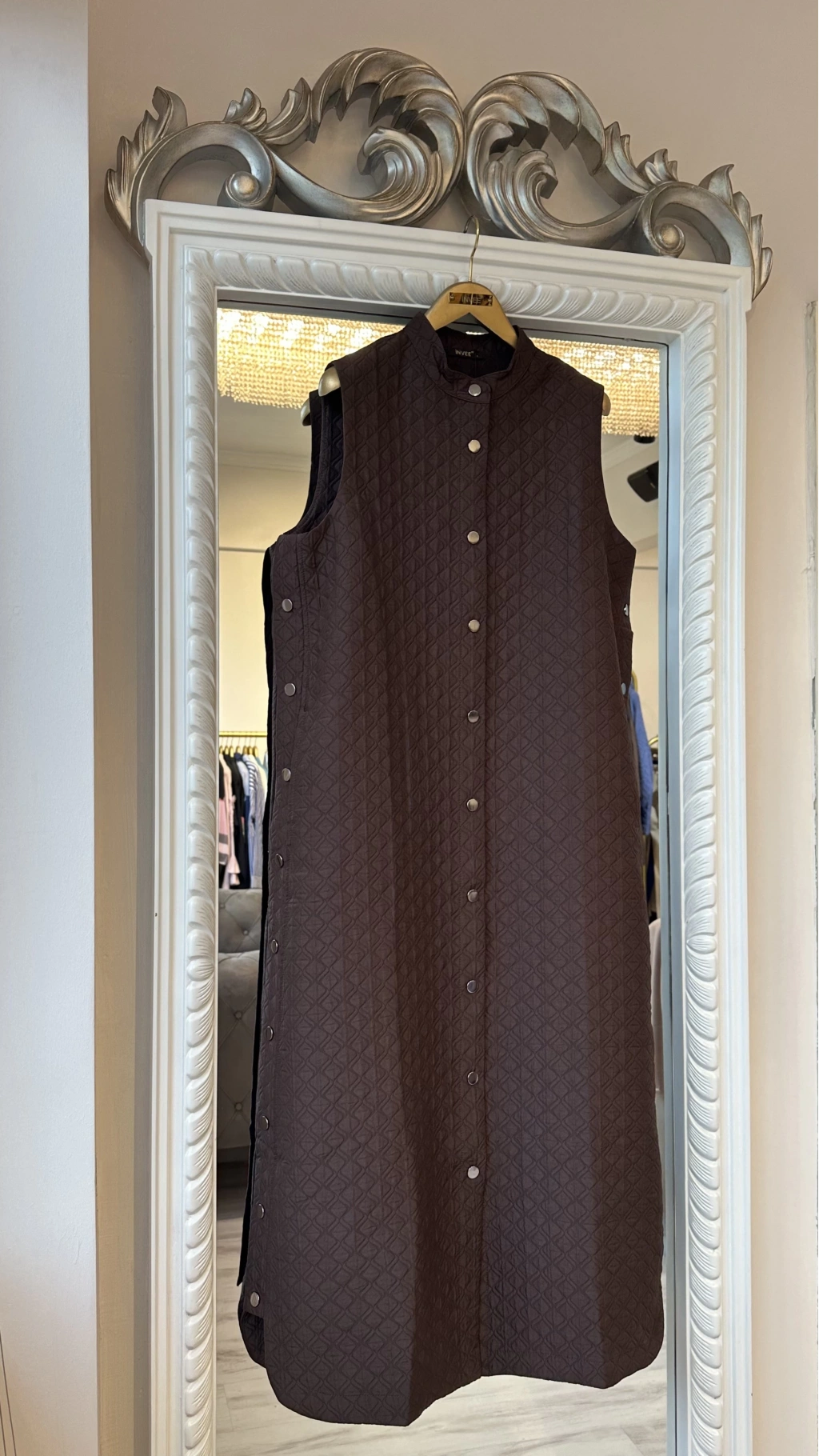 Zarif ve modern çizgileriyle öne çıkan bu kahverengi uzun yelek, minimal tasarımıyla her stile sofistike bir dokunuş katıyor. Kapitone dokusu ve metal düğme detayları sayesinde hem klasik hem de şehirli bir görünüm sunar.