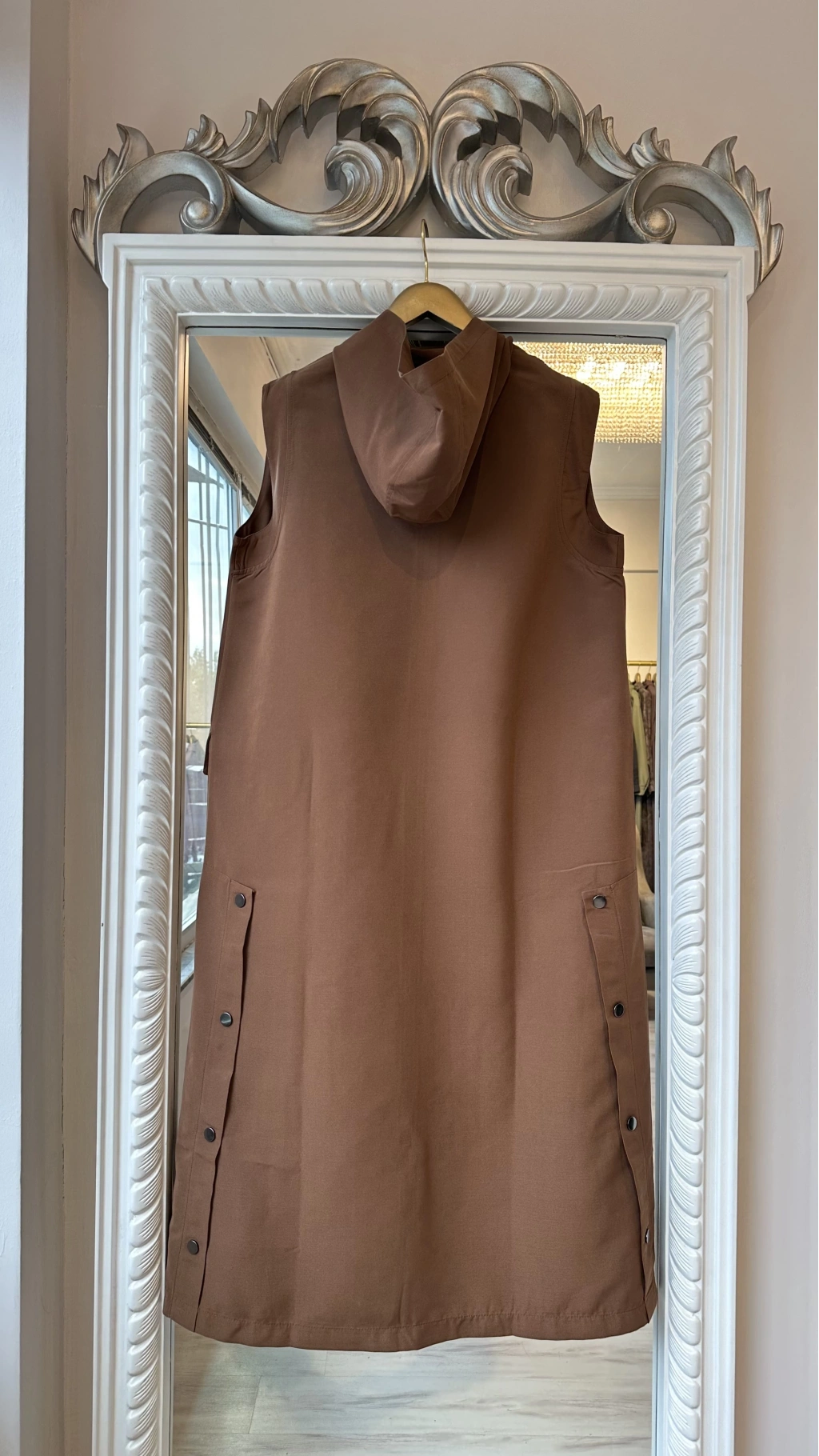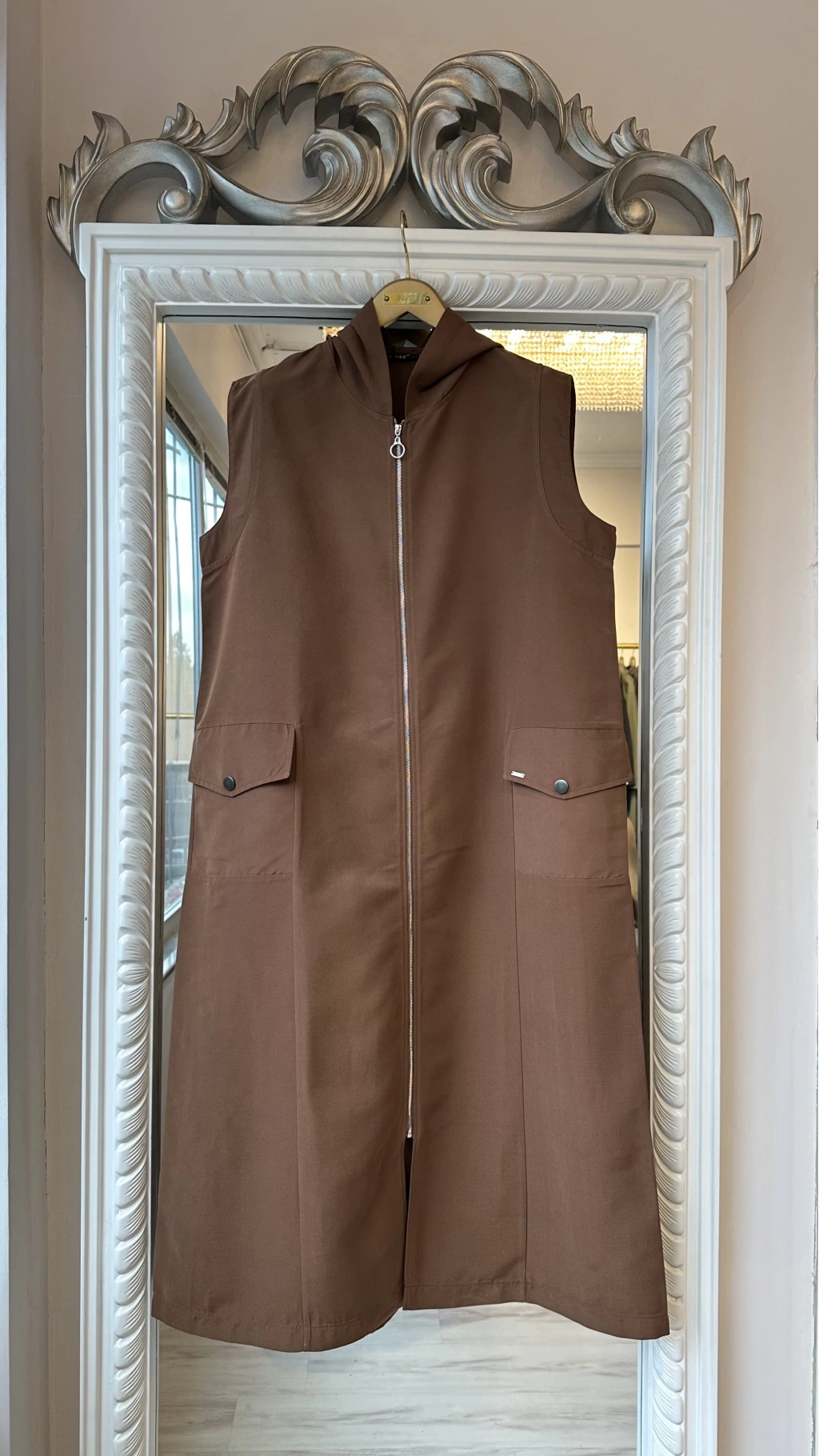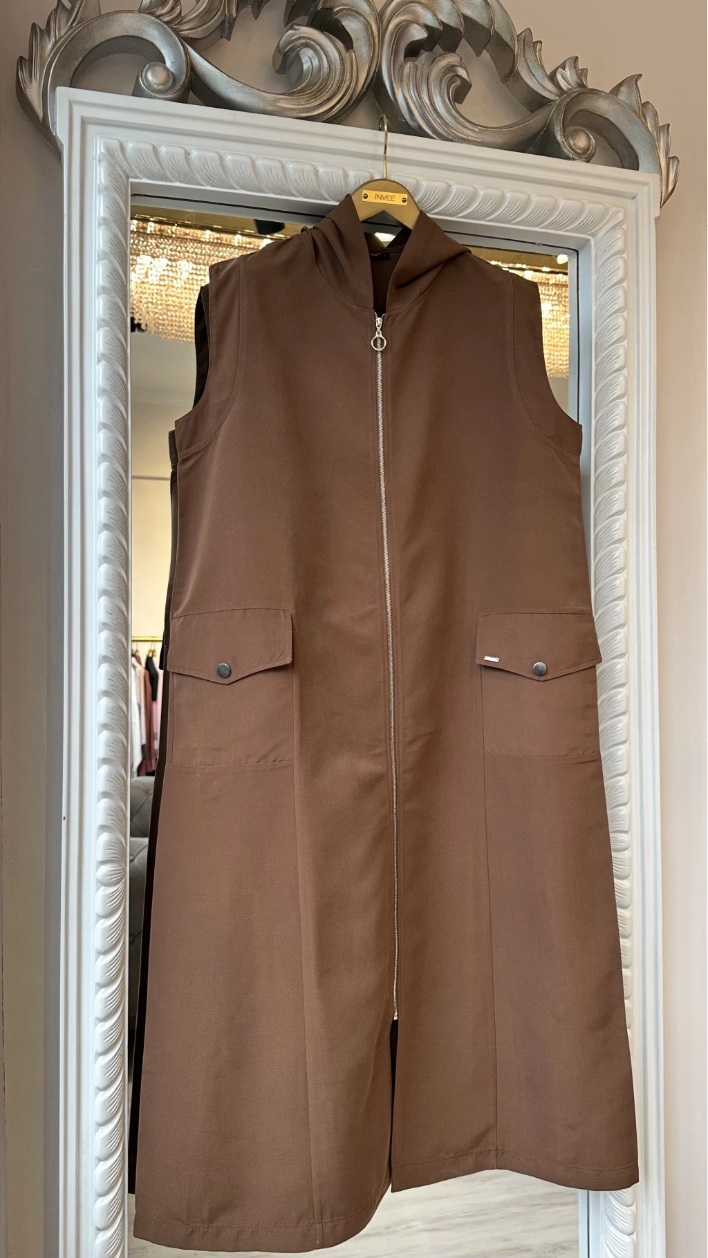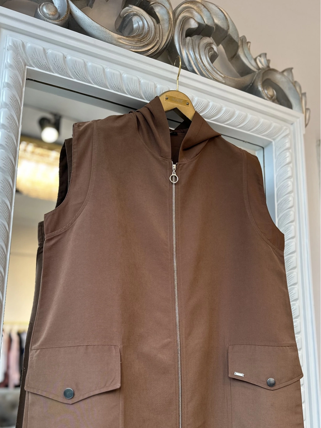 Zamansız tasarım, modern detaylarla birleşiyor. Kahverengi Kapüşonlu Uzun Yelek, sade ama güçlü bir siluetiyle sezonun en çok tercih edilen tamamlayıcı parçalarından biri.