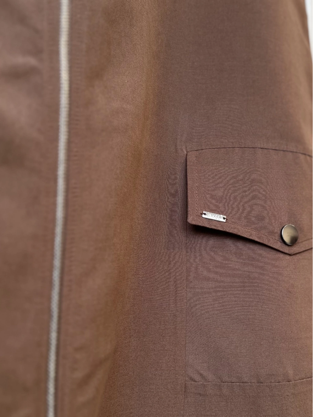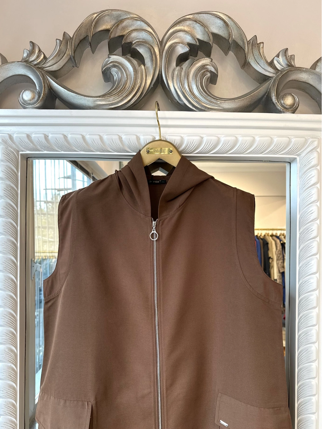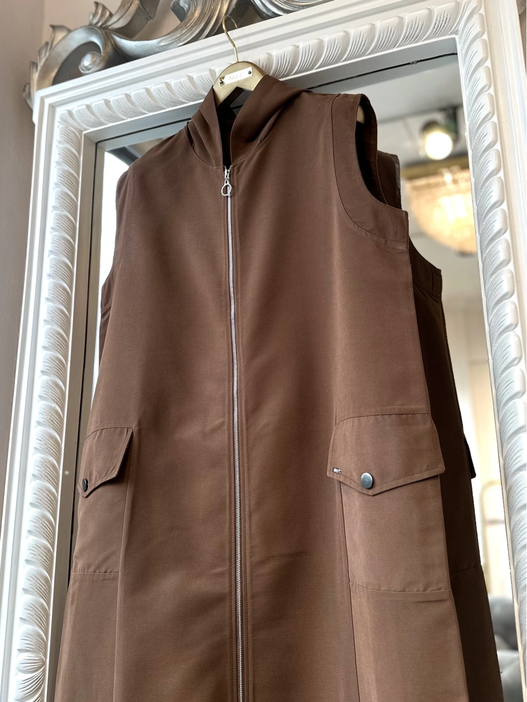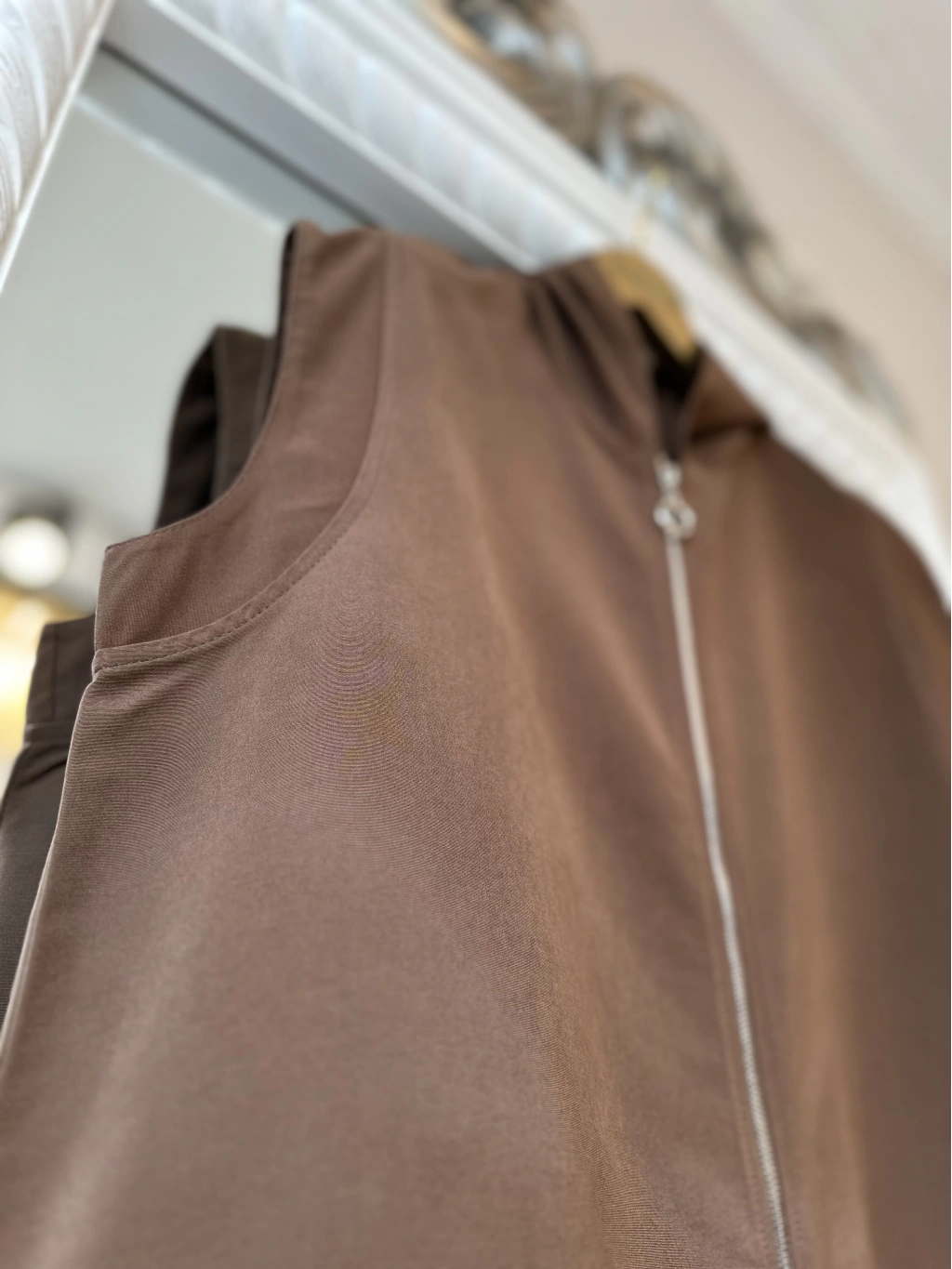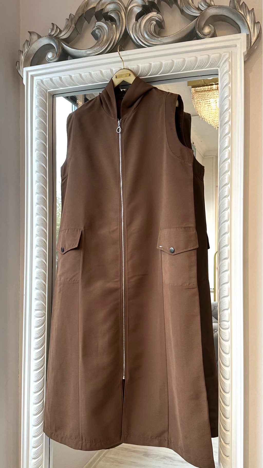 Zamansız tasarım, modern detaylarla birleşiyor. Kahverengi Kapüşonlu Uzun Yelek, sade ama güçlü bir siluetiyle sezonun en çok tercih edilen tamamlayıcı parçalarından biri.