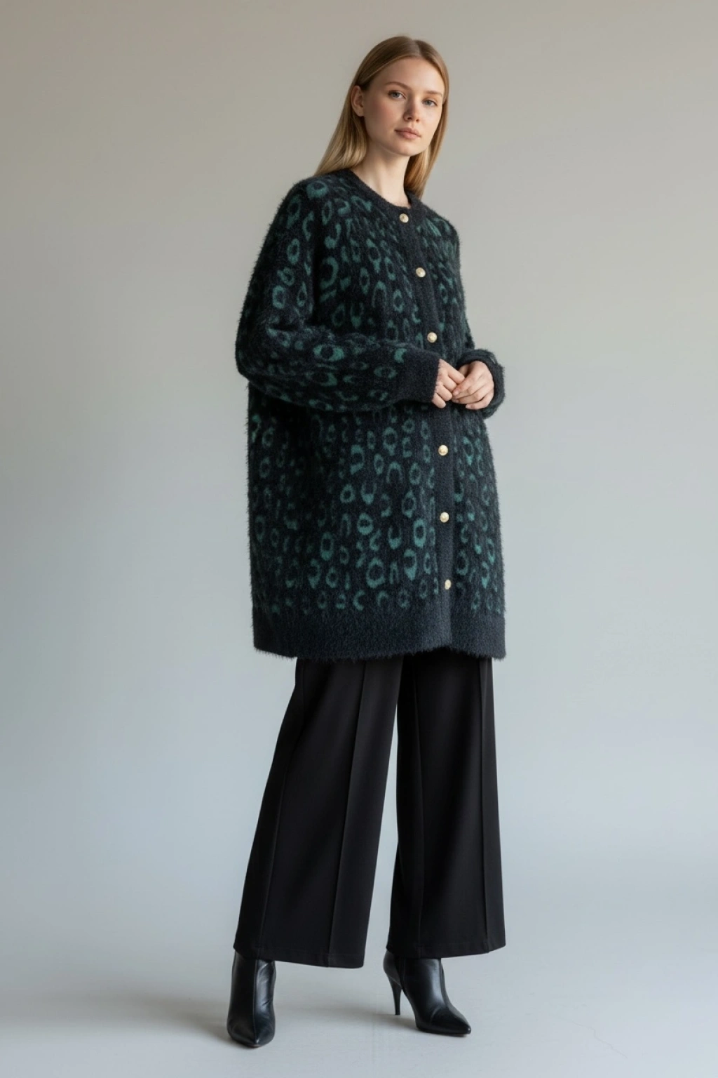 Zamansız desenleri ve sıcak dokusuyla öne çıkan desenli triko hırka, günlük şıklığa modern bir yorum katıyor. Yumuşak ve tok triko kumaşı sayesinde serin havalarda konforlu bir kullanım sunarken, allover desen yapısı modele hareketli ve stil sahibi bir görünüm kazandırır.