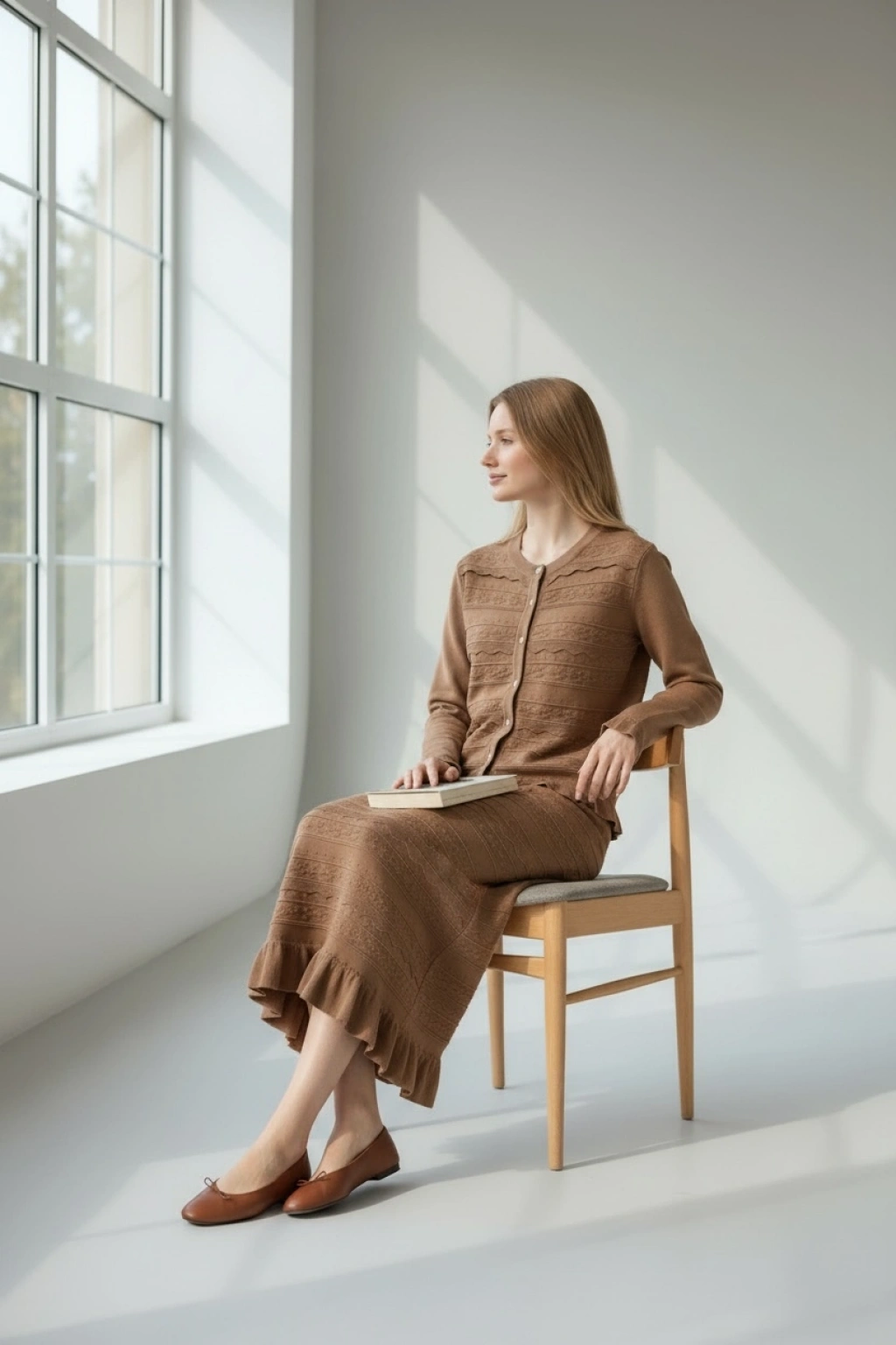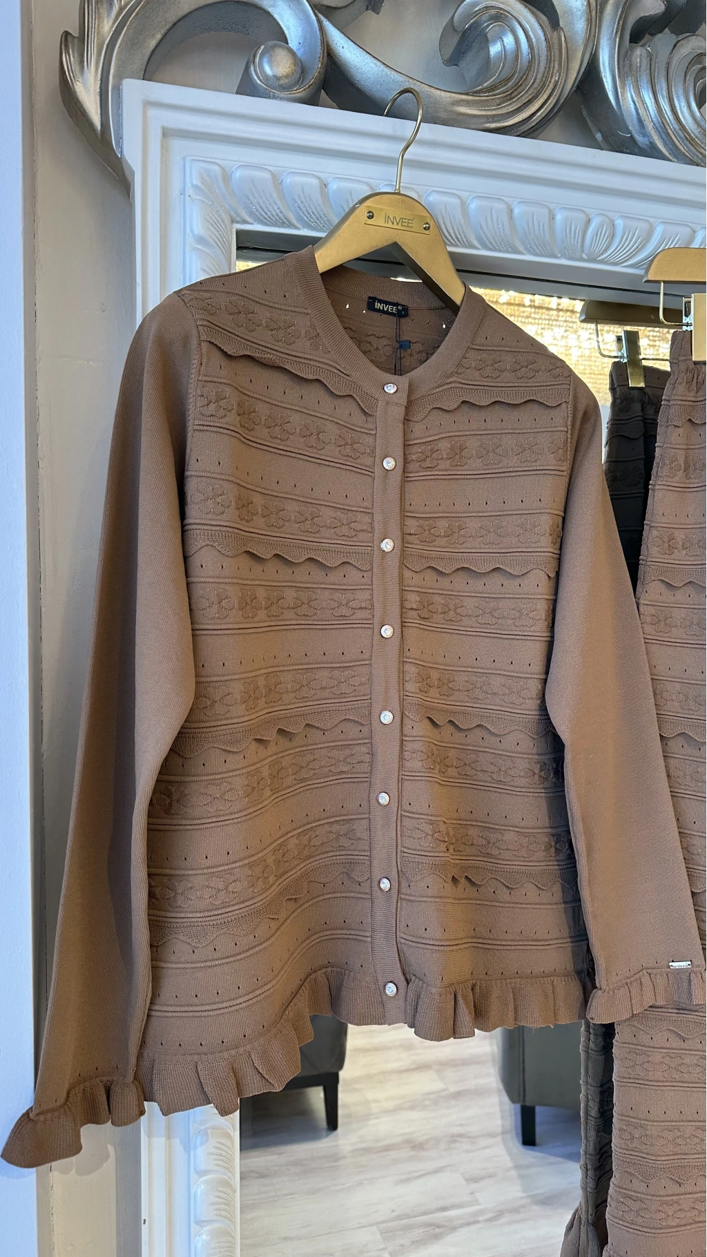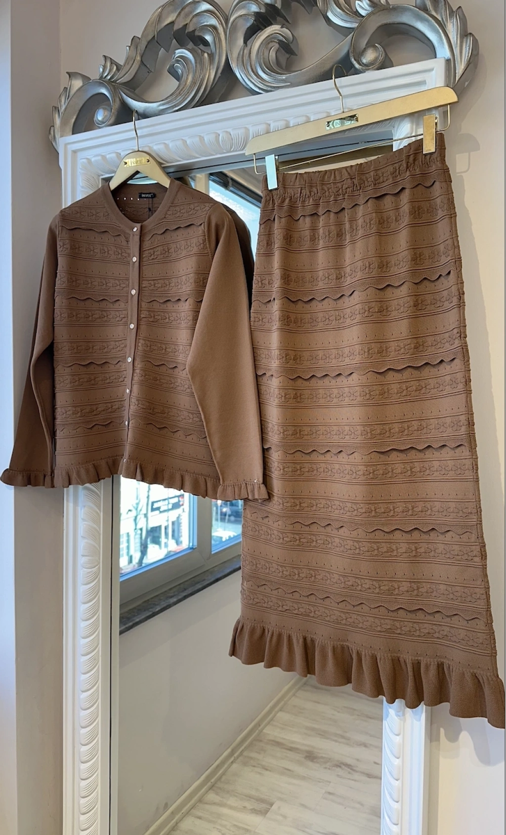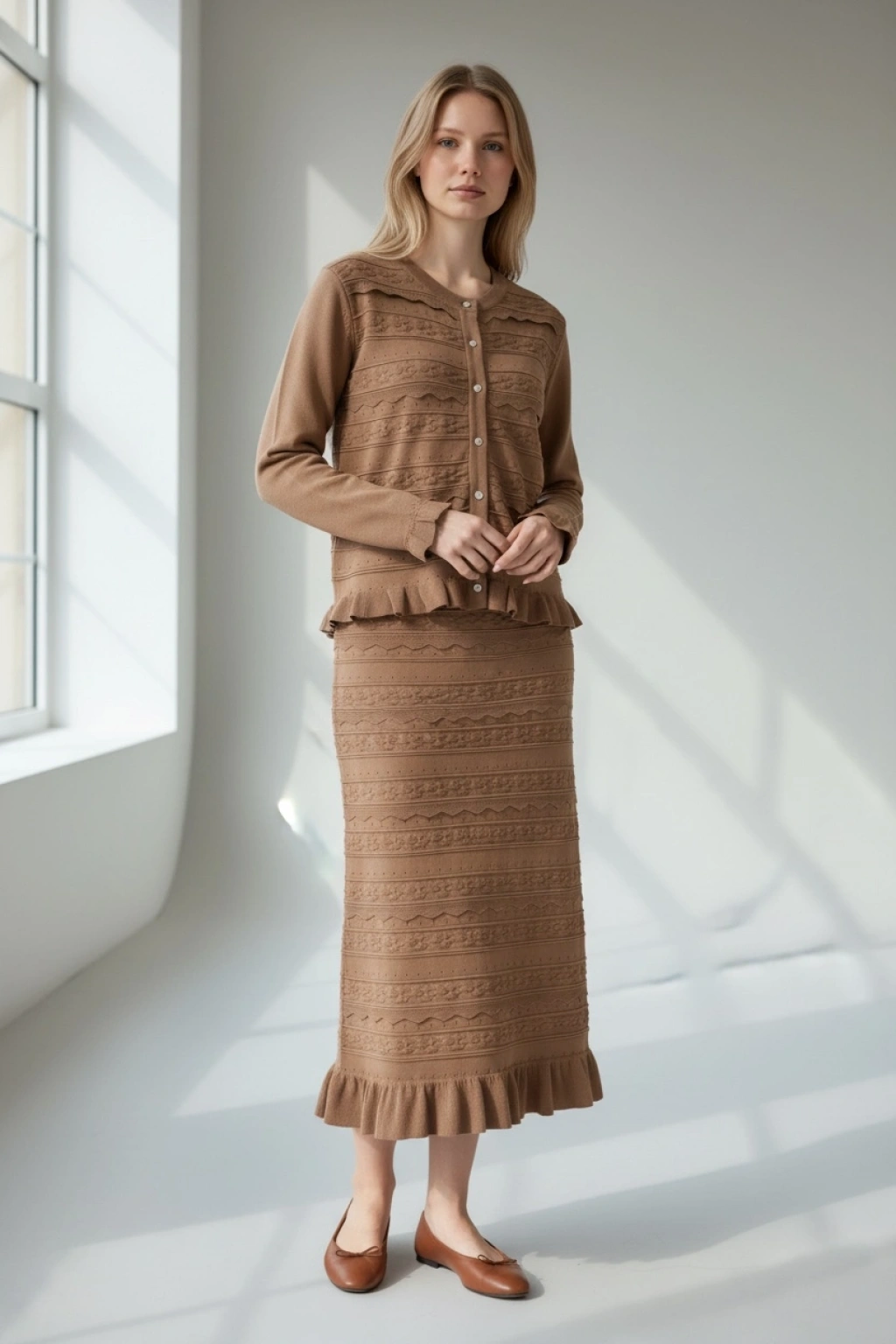 Önü düğme kapamalı hırka modeli klasik ve feminen bir duruş sunarken, etek ucundaki volan detayı takıma hareket ve zarafet katar. Uzun etek formu ile hem günlük şık kombinlerde hem de özel davetlerde rahatlıkla tercih edilebilir.
