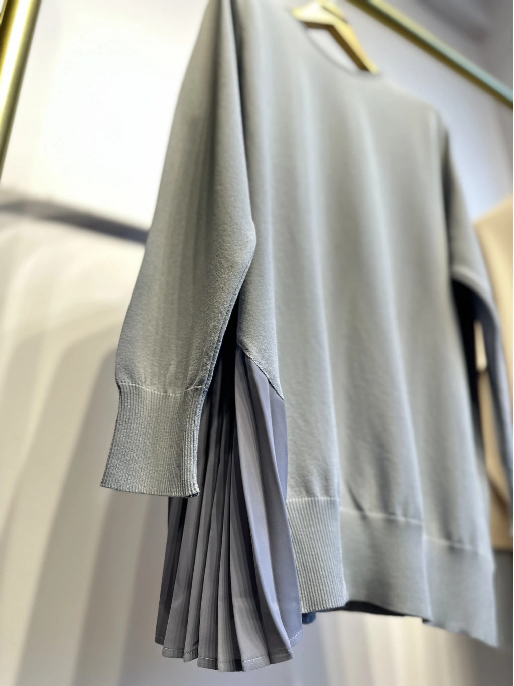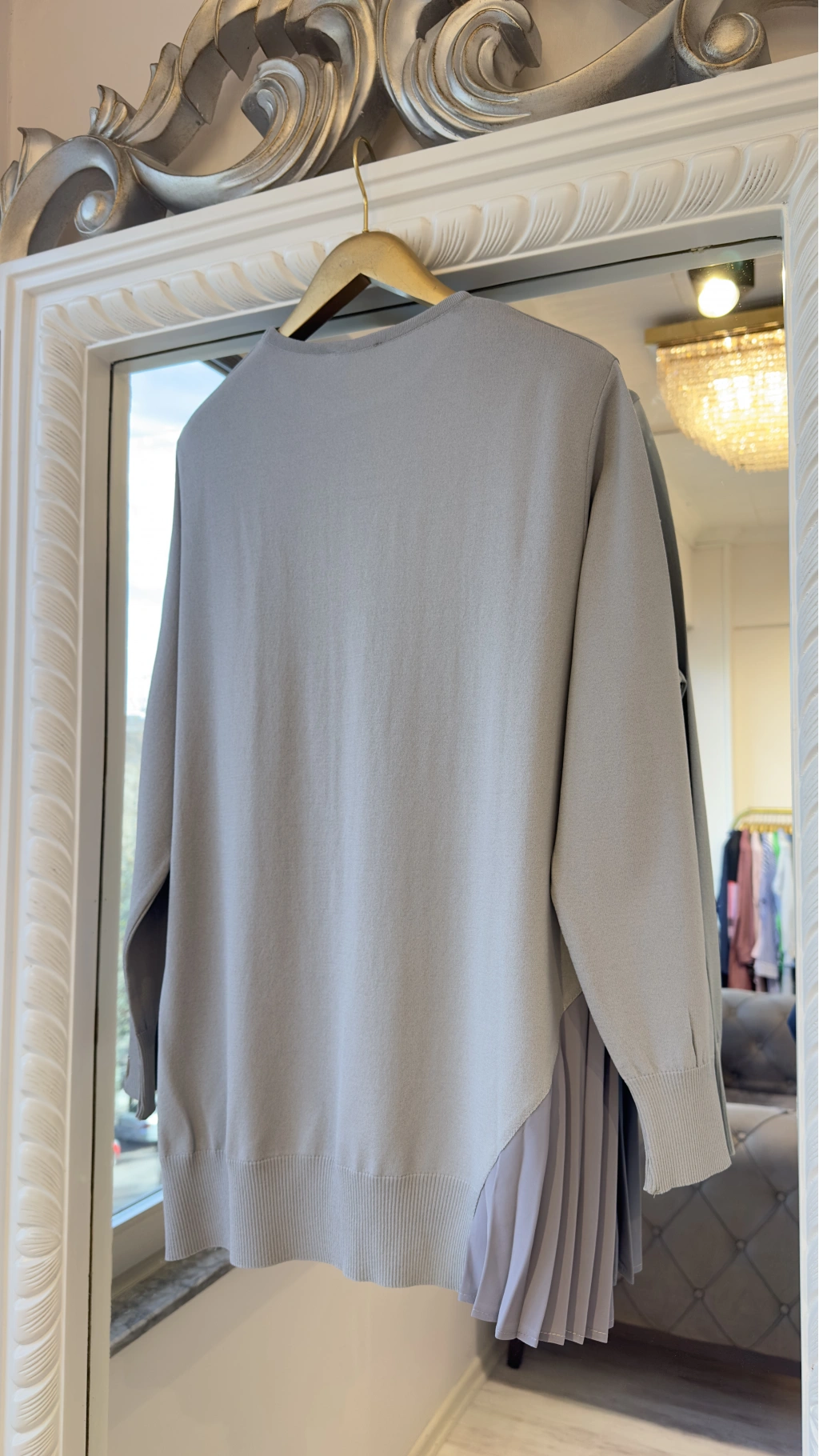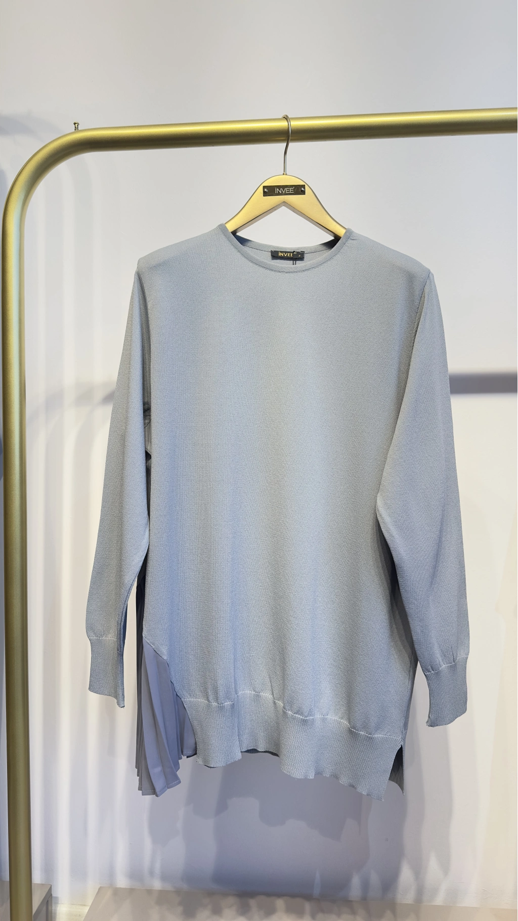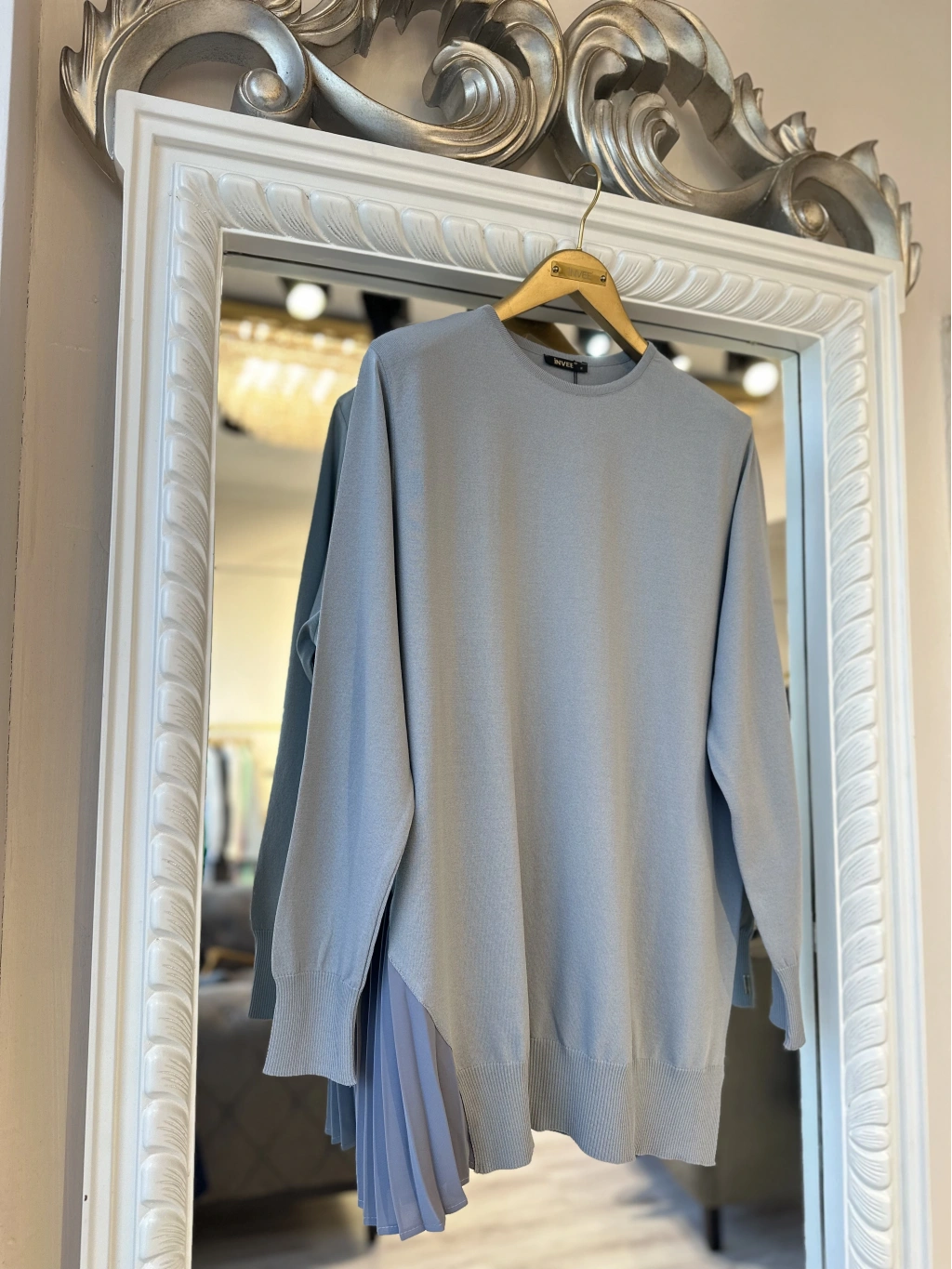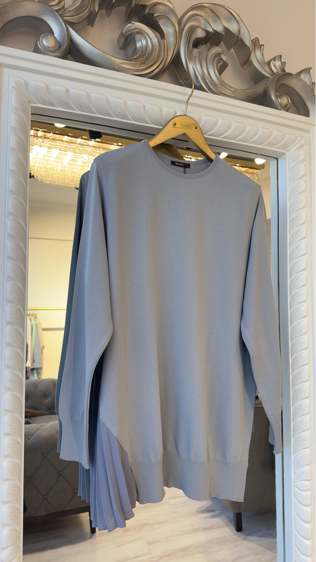 Zamansız şıklığı modern detaylarla buluşturan gri asimetrik plise detaylı triko tunik, hem günlük kullanım hem de ofis şıklığı için ideal bir parçadır. Minimal tasarımı sayesinde sade bir duruş sunarken, arka kısmındaki plise detay ve asimetrik kesim ile stilinize hareket ve zarafet katar.
