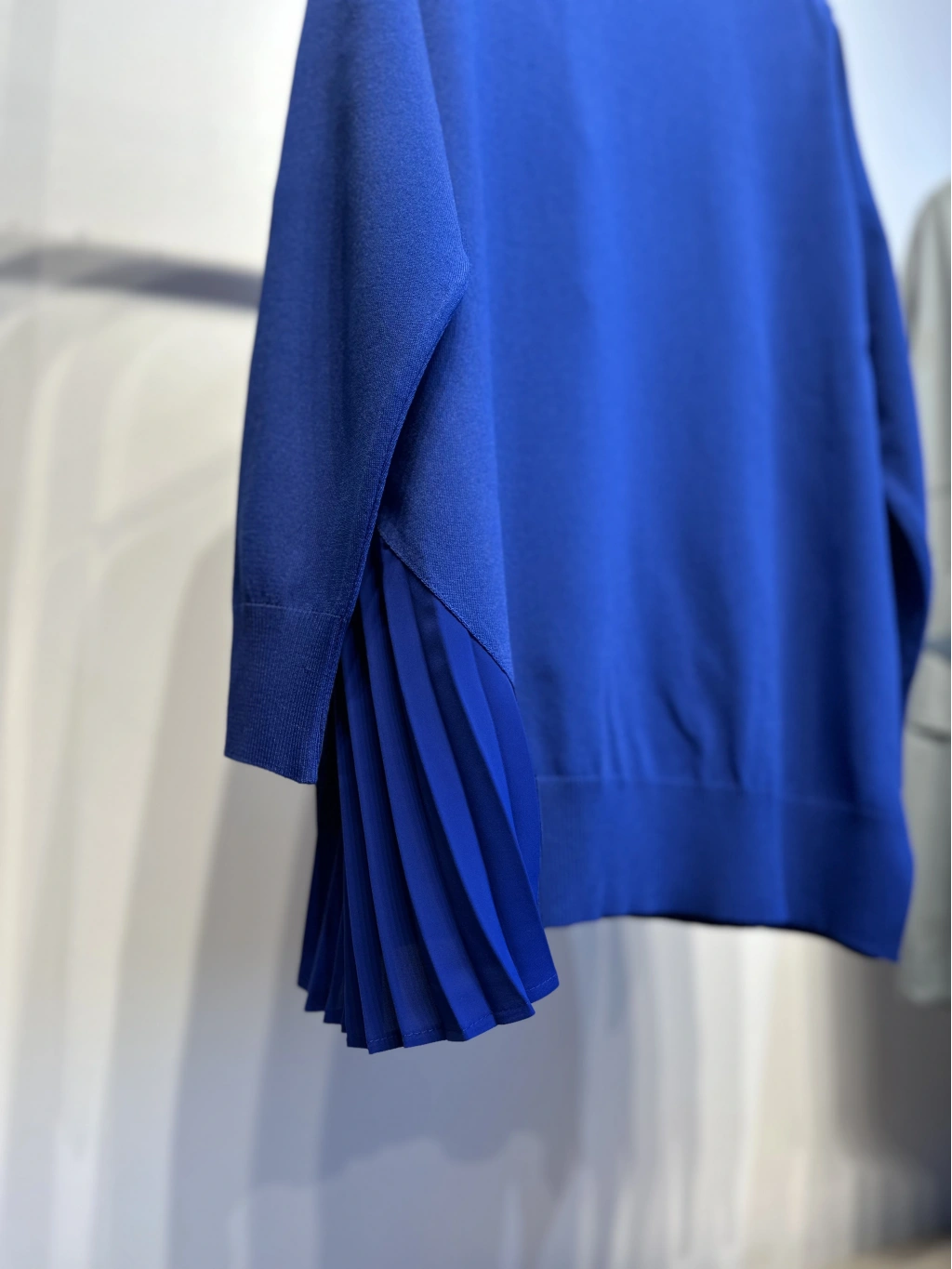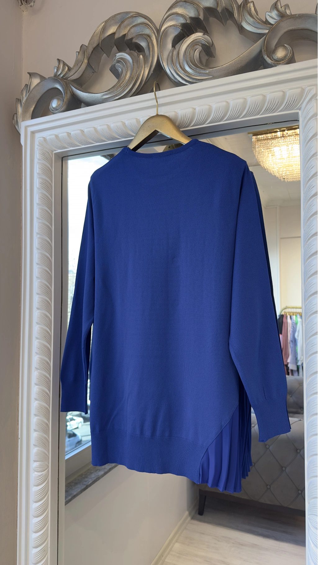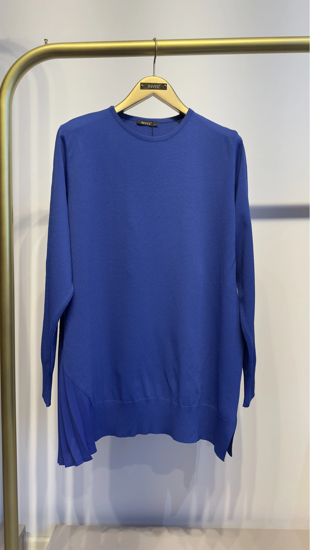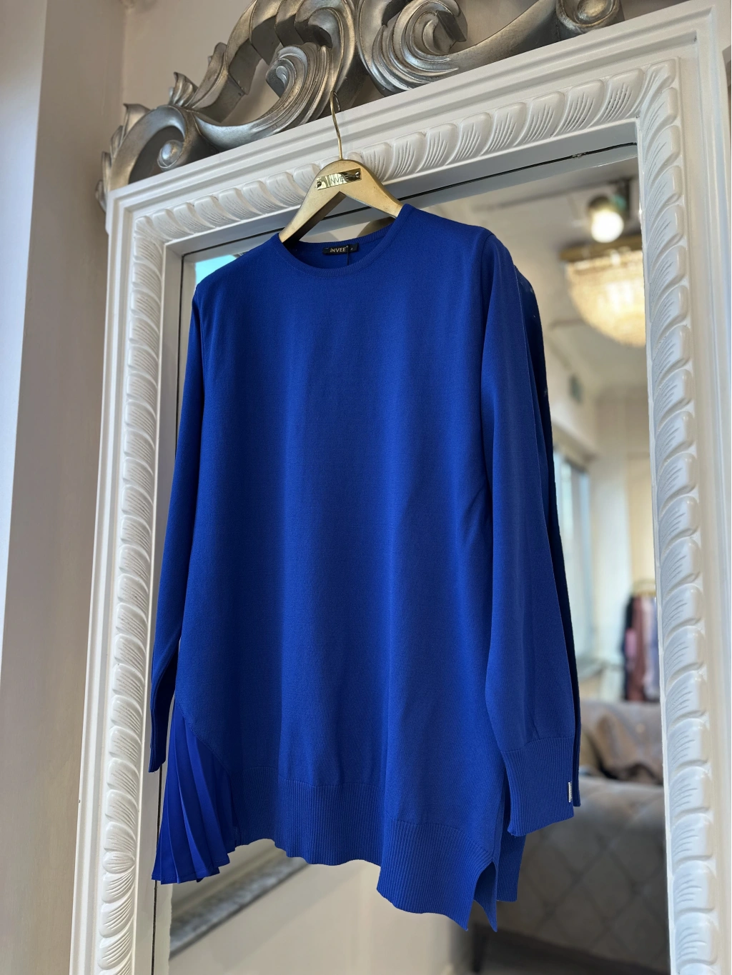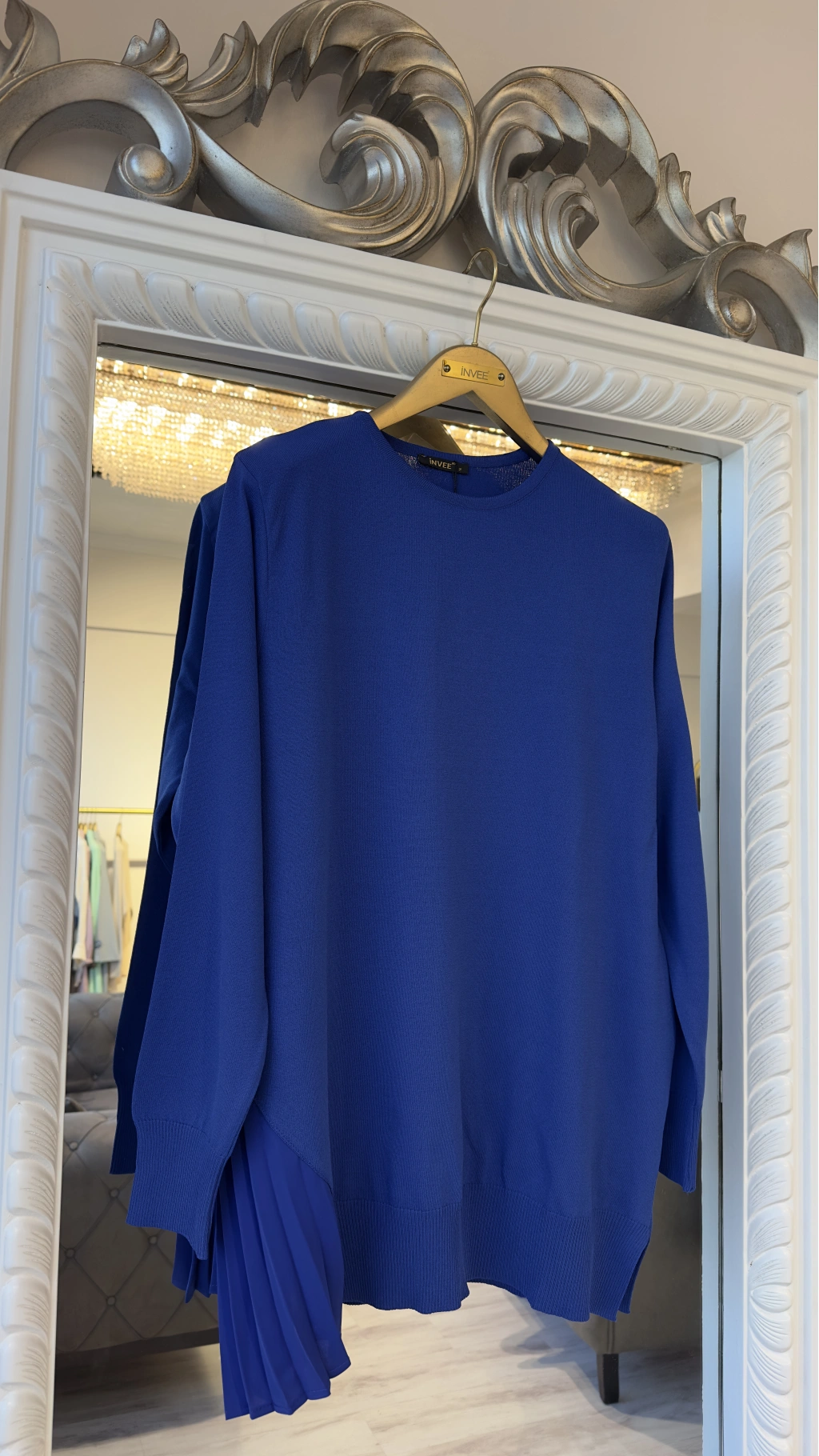 Zamansız şıklığı modern detaylarla buluşturan sax asimetrik plise detaylı triko tunik, hem günlük kullanım hem de ofis şıklığı için ideal bir parçadır. Minimal tasarımı sayesinde sade bir duruş sunarken, arka kısmındaki plise detay ve asimetrik kesim ile stilinize hareket ve zarafet katar.