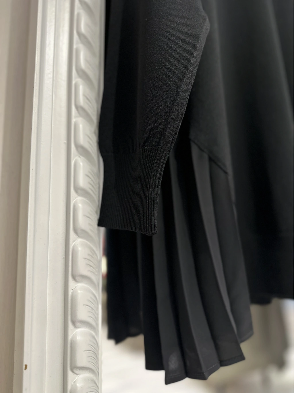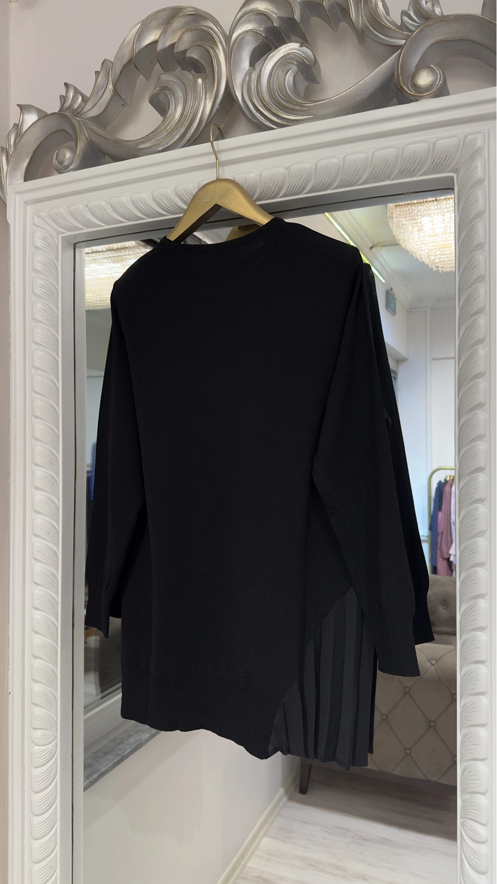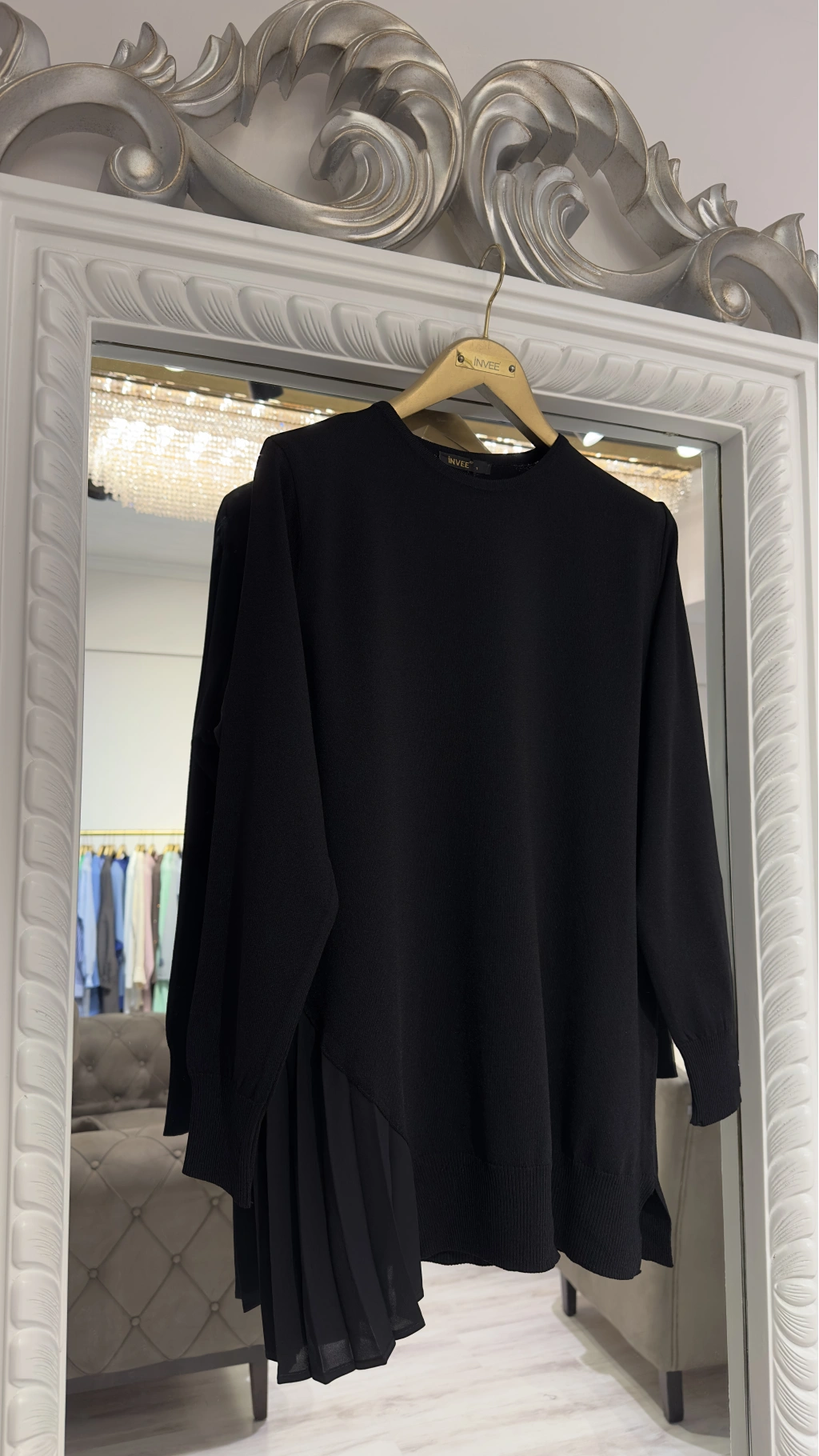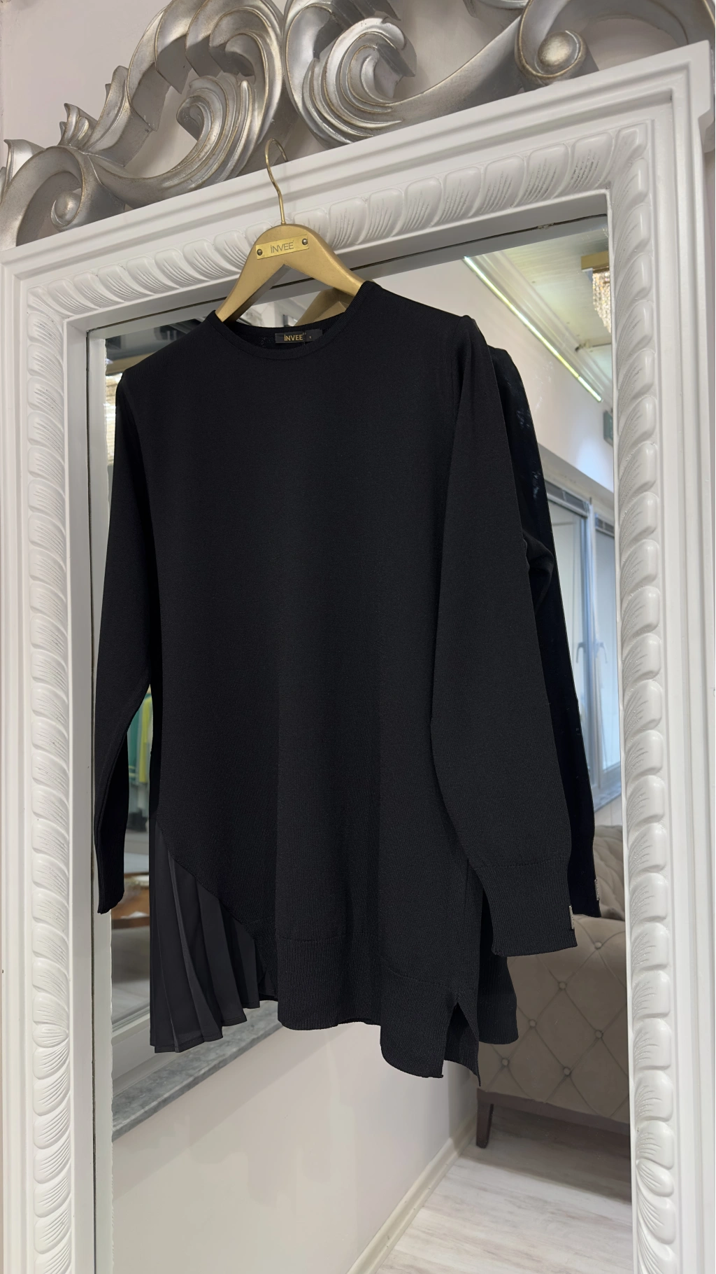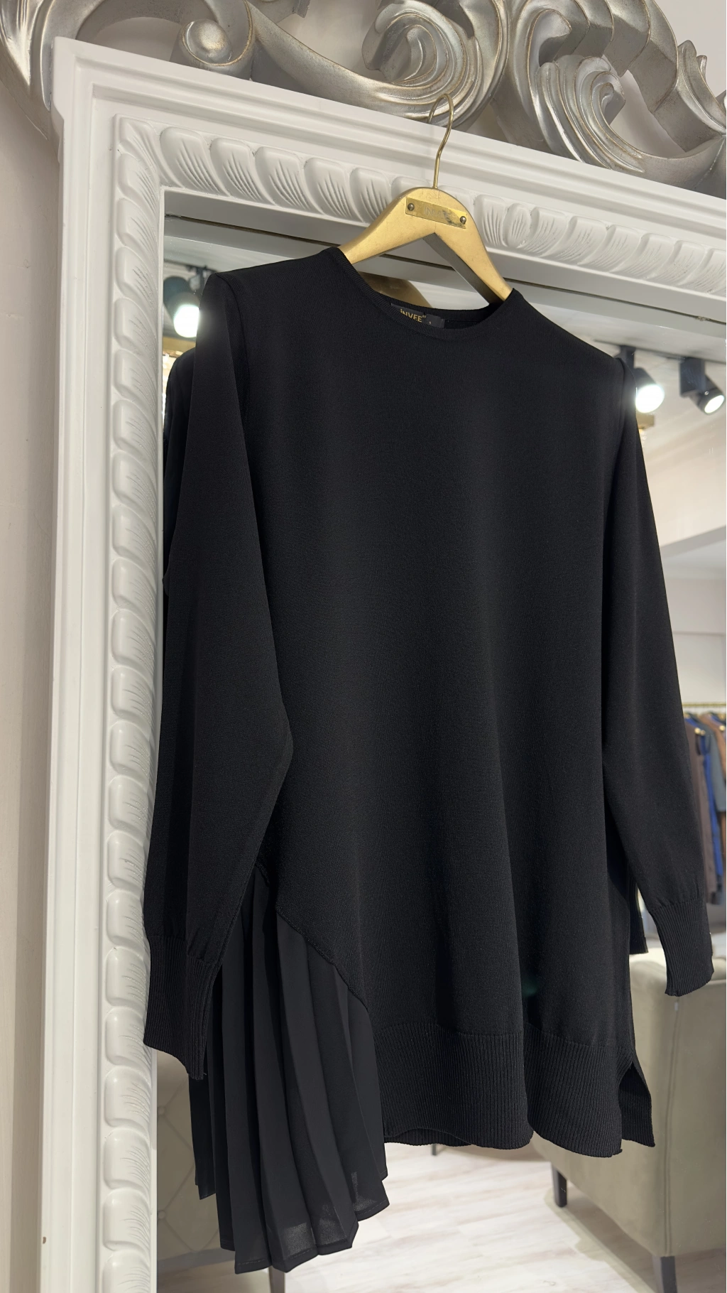 Zamansız şıklığı modern detaylarla buluşturan siyah asimetrik plise detaylı triko tunik, hem günlük kullanım hem de ofis şıklığı için ideal bir parçadır. Minimal tasarımı sayesinde sade bir duruş sunarken, arka kısmındaki plise detay ve asimetrik kesim ile stilinize hareket ve zarafet katar.