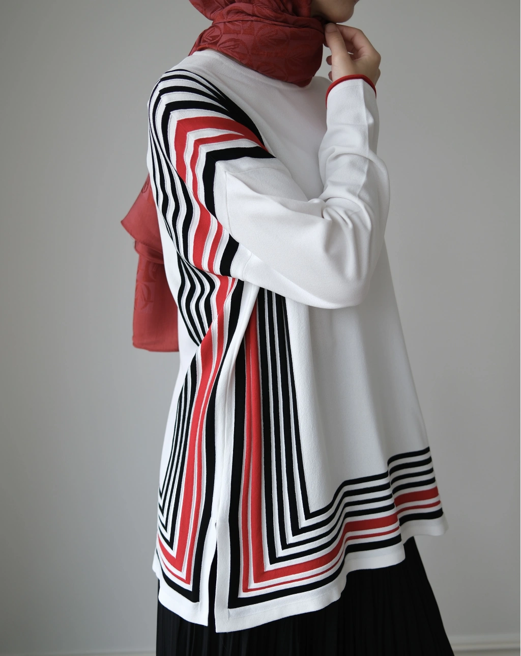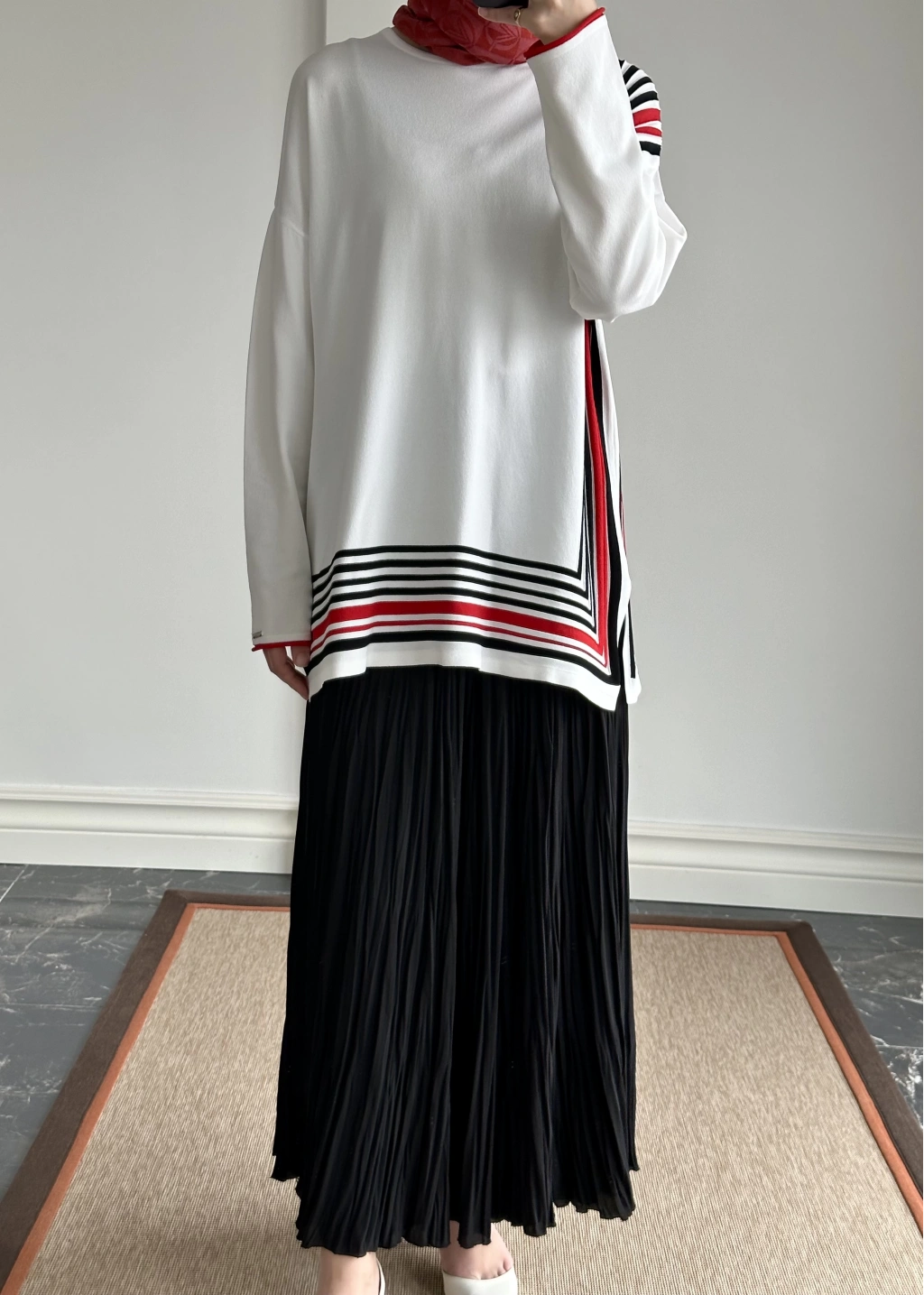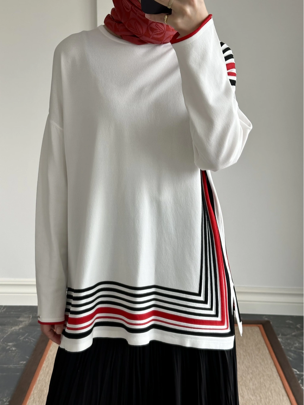 Modern ve rahat çizgileriyle öne çıkan bu beyaz triko tunik, sade şıklığı ve konforu bir araya getiriyor. Yumuşak dokulu kumaşı sayesinde gün boyu rahat bir kullanım sunarken, etek ve kol uçlarındaki siyah–kırmızı çizgi detayları tasarıma dinamik bir dokunuş katıyor.