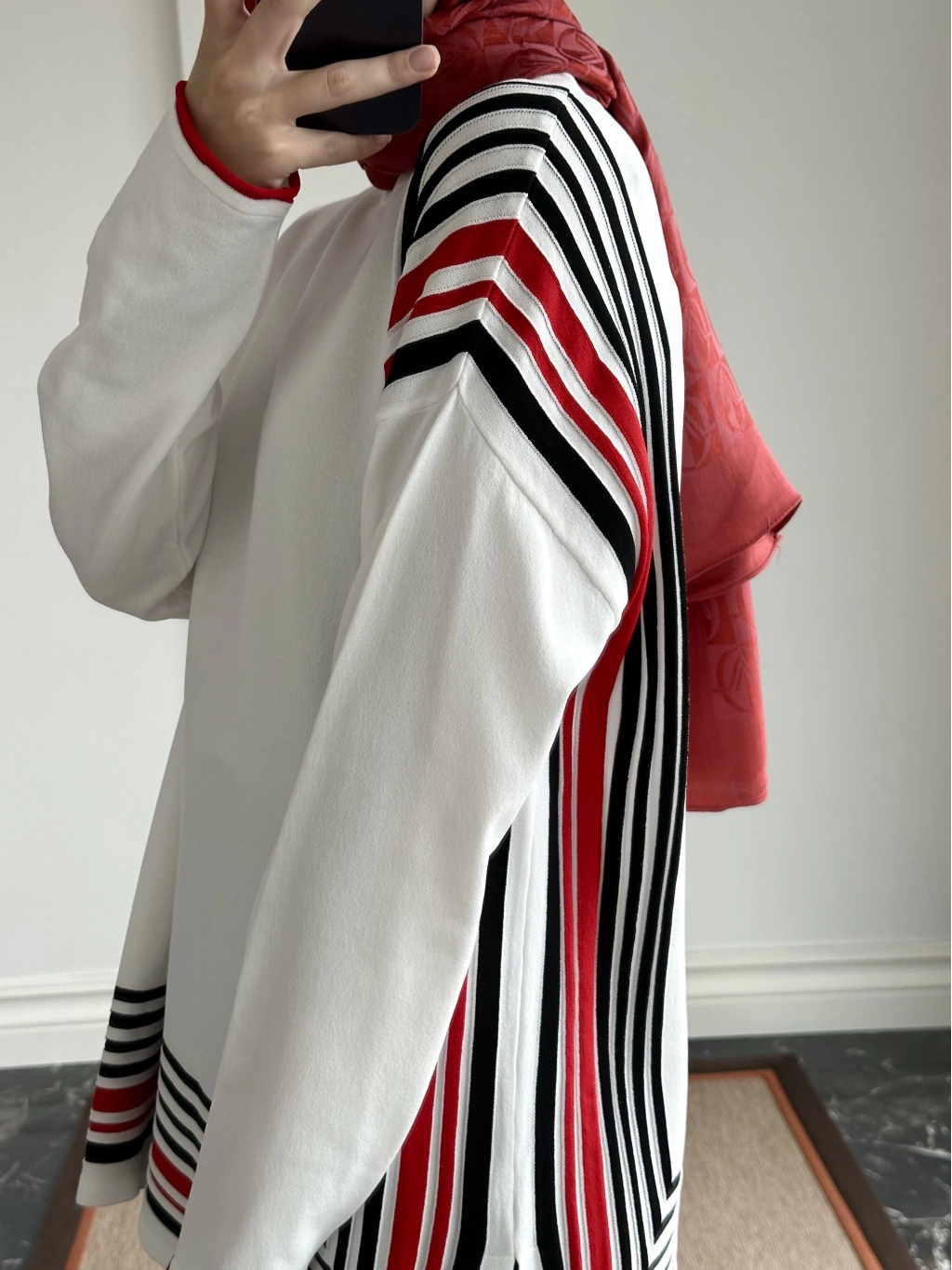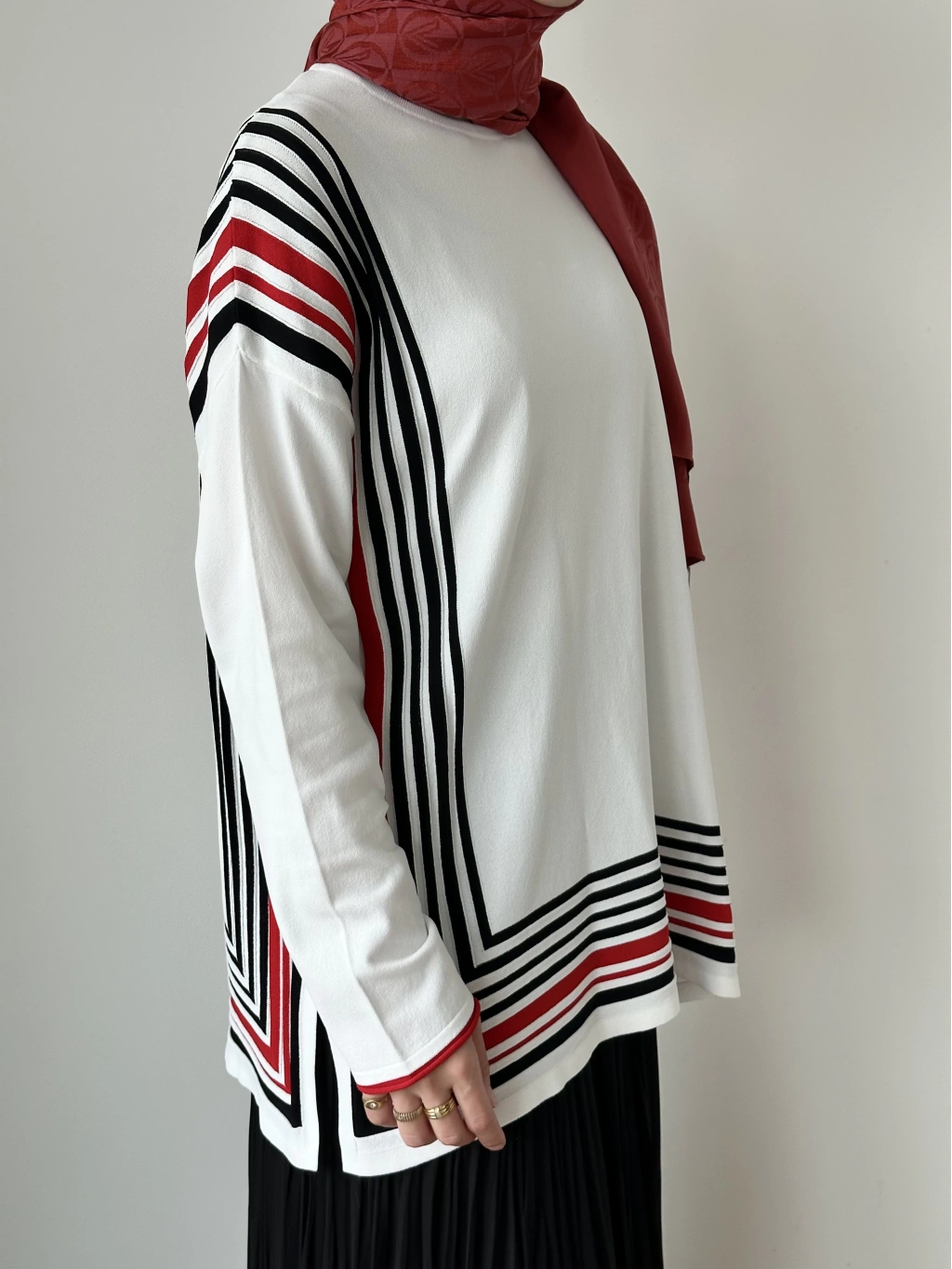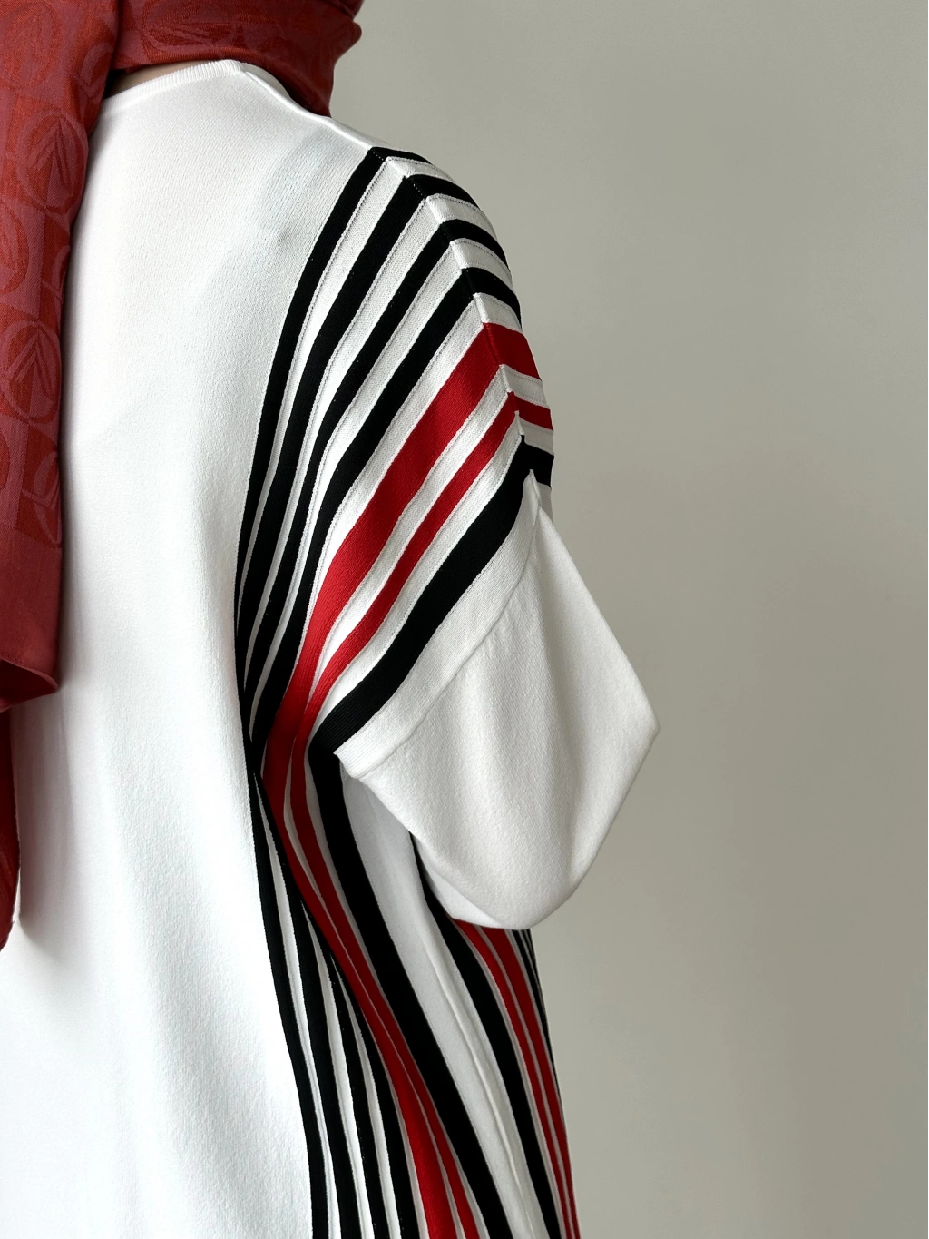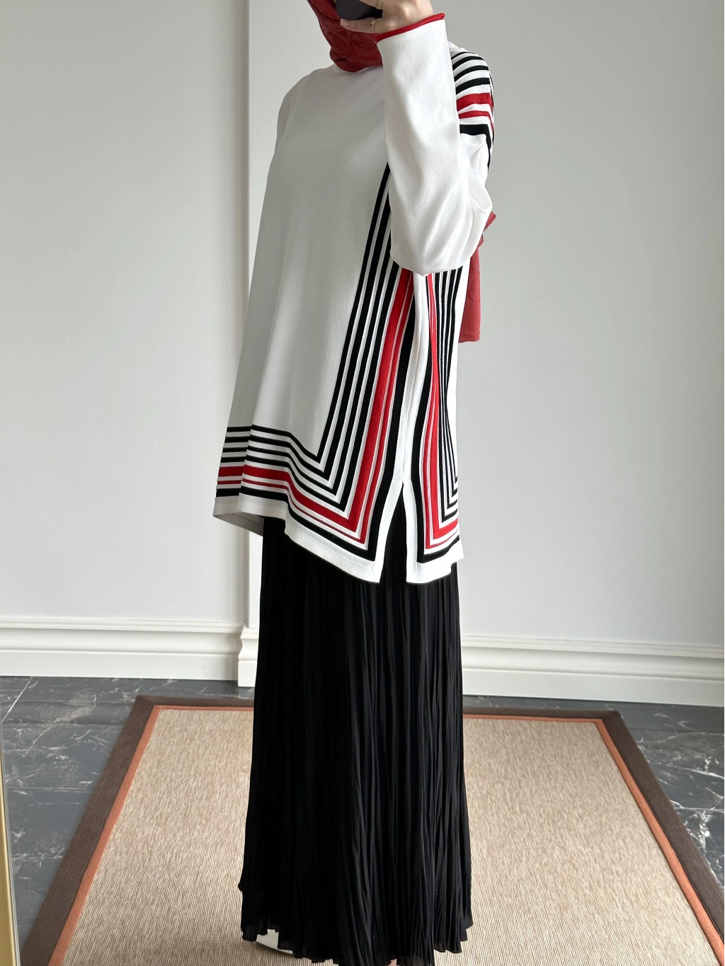 Modern ve rahat çizgileriyle öne çıkan bu beyaz triko tunik, sade şıklığı ve konforu bir araya getiriyor. Yumuşak dokulu kumaşı sayesinde gün boyu rahat bir kullanım sunarken, etek ve kol uçlarındaki siyah–kırmızı çizgi detayları tasarıma dinamik bir dokunuş katıyor.