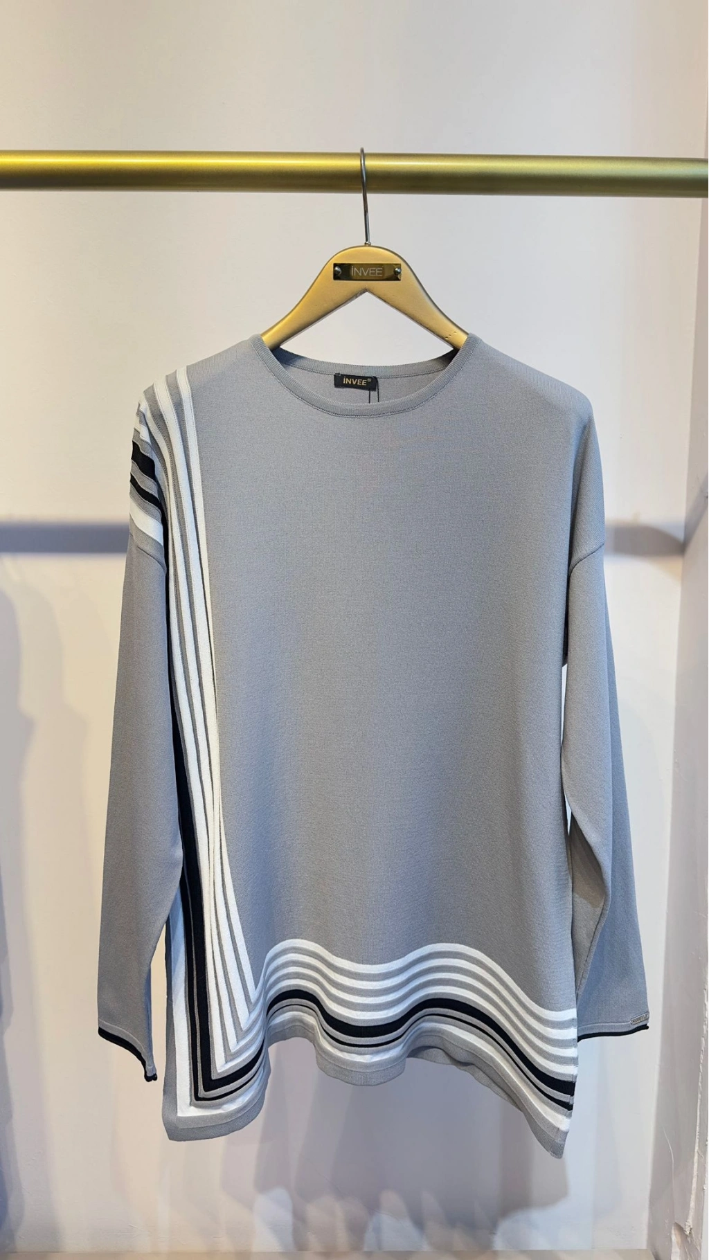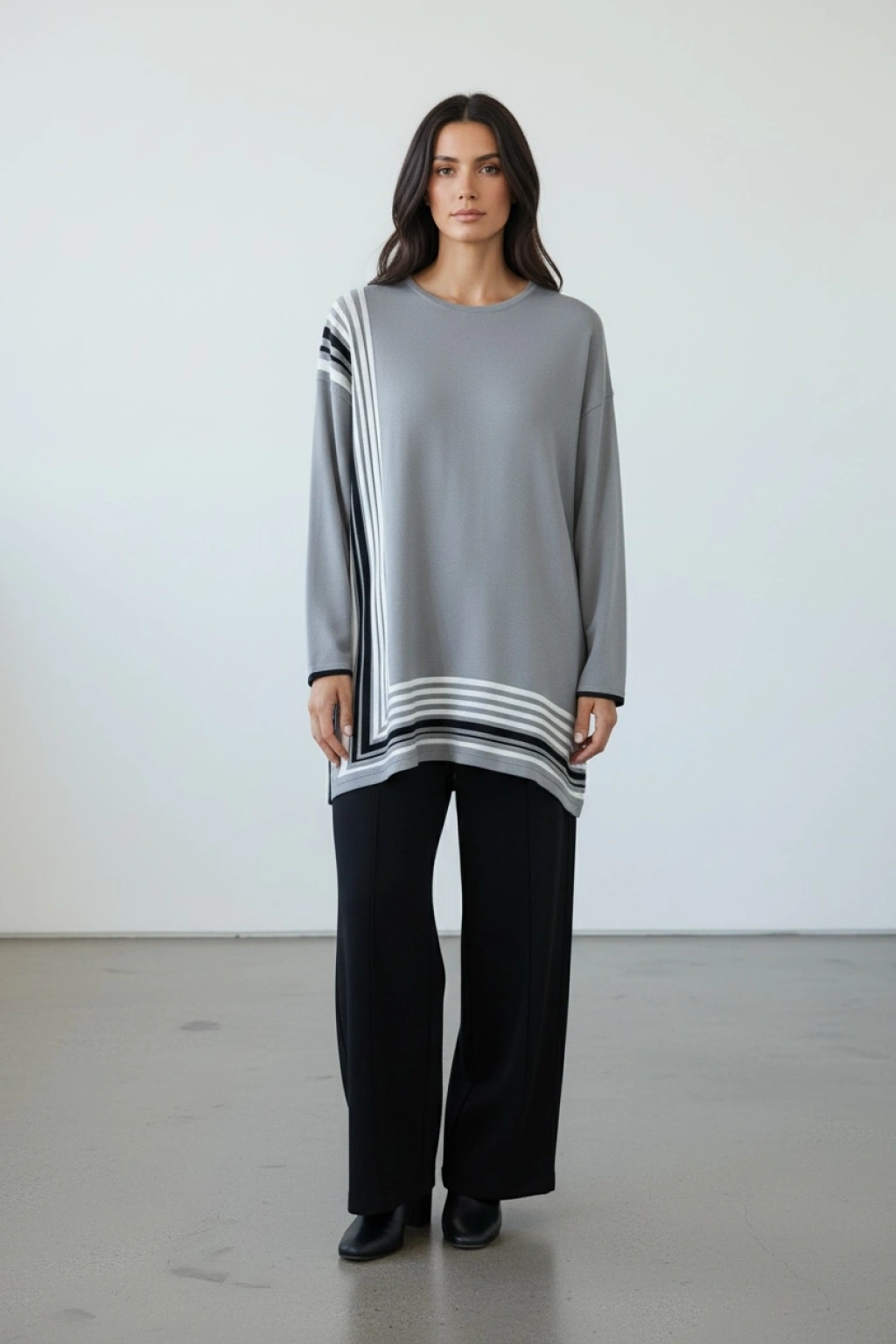 Modern ve rahat çizgileriyle öne çıkan bu gri triko tunik, sade şıklığı ve konforu bir araya getiriyor. Yumuşak dokulu kumaşı sayesinde gün boyu rahat bir kullanım sunarken, etek ve kol uçlarındaki siyah–kırmızı çizgi detayları tasarıma dinamik bir dokunuş katıyor.