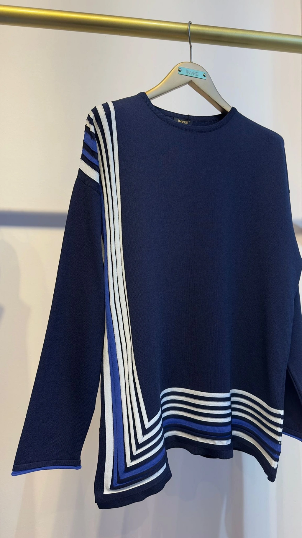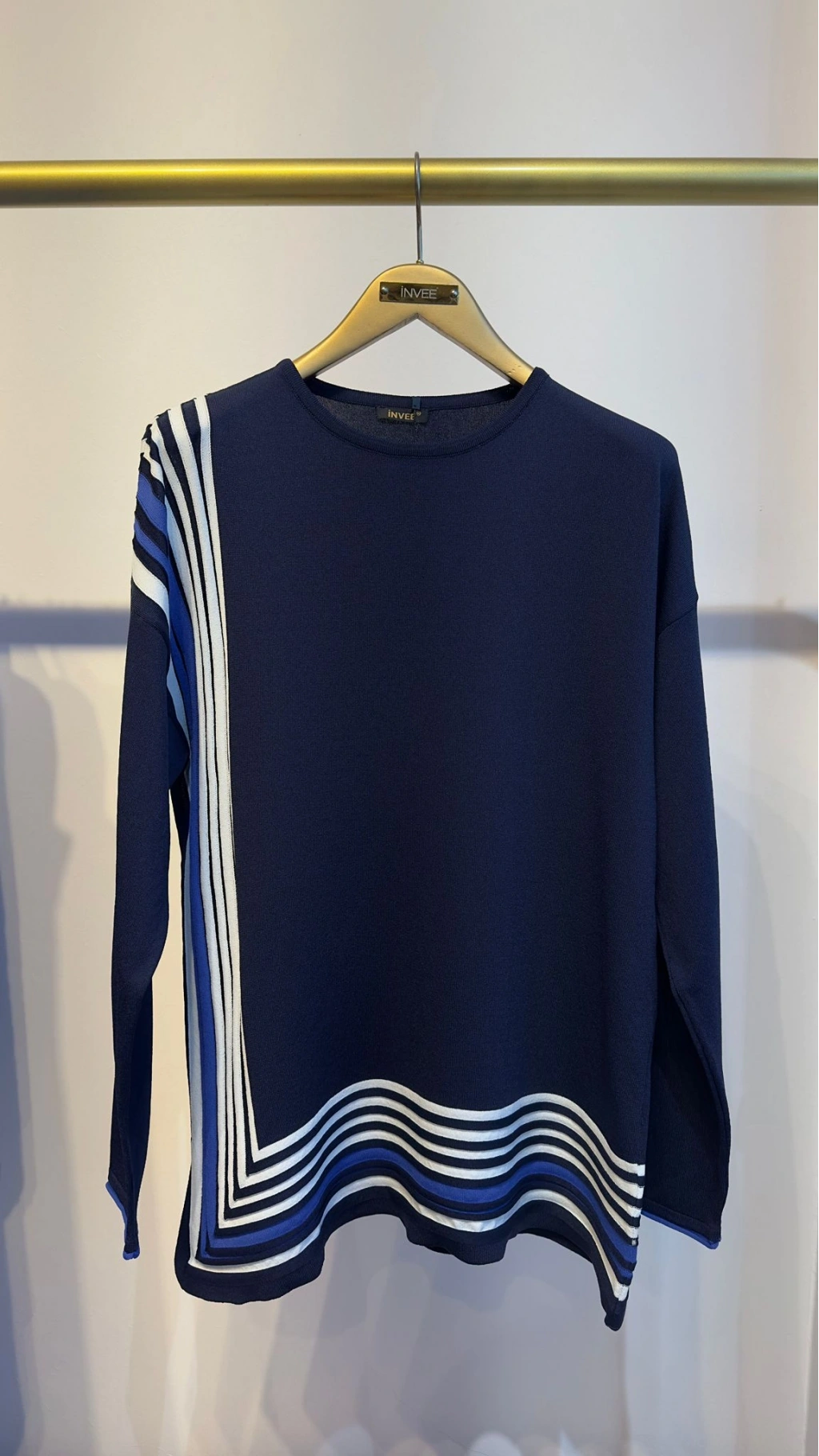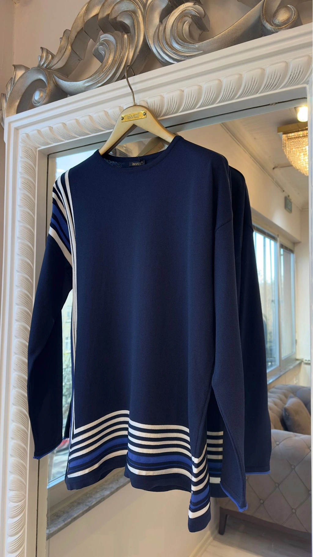 Modern ve rahat çizgileriyle öne çıkan bu lacivert triko tunik, sade şıklığı ve konforu bir araya getiriyor. Yumuşak dokulu kumaşı sayesinde gün boyu rahat bir kullanım sunarken, etek ve kol uçlarındaki siyah–kırmızı çizgi detayları tasarıma dinamik bir dokunuş katıyor.