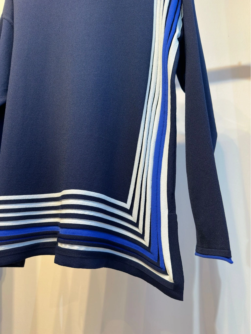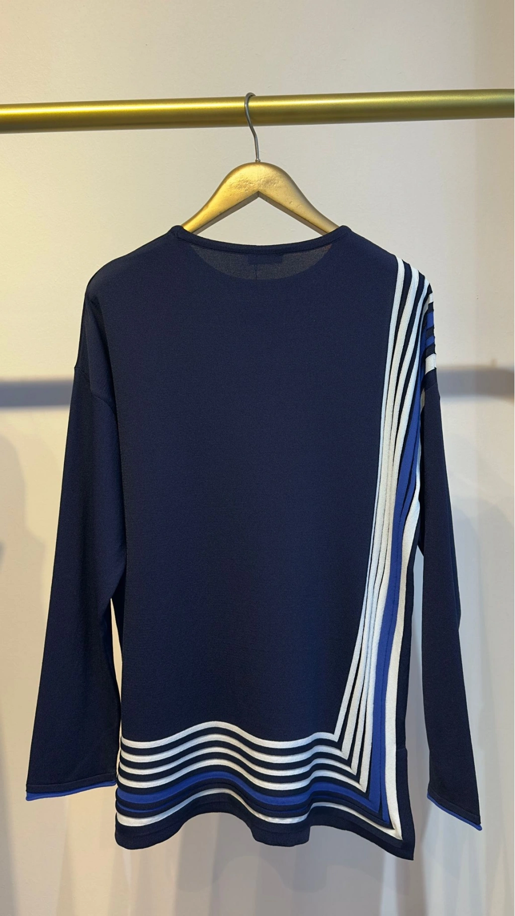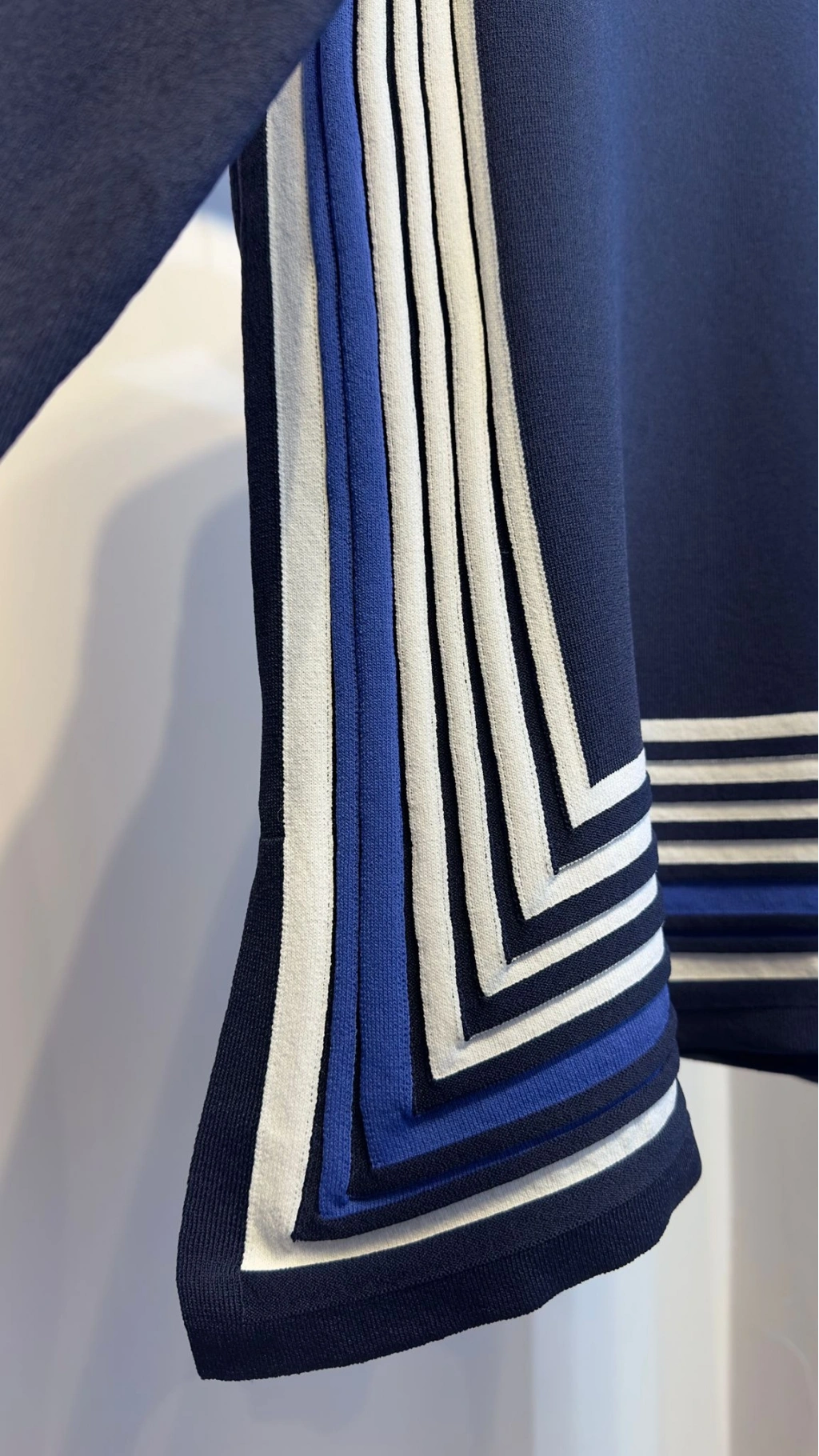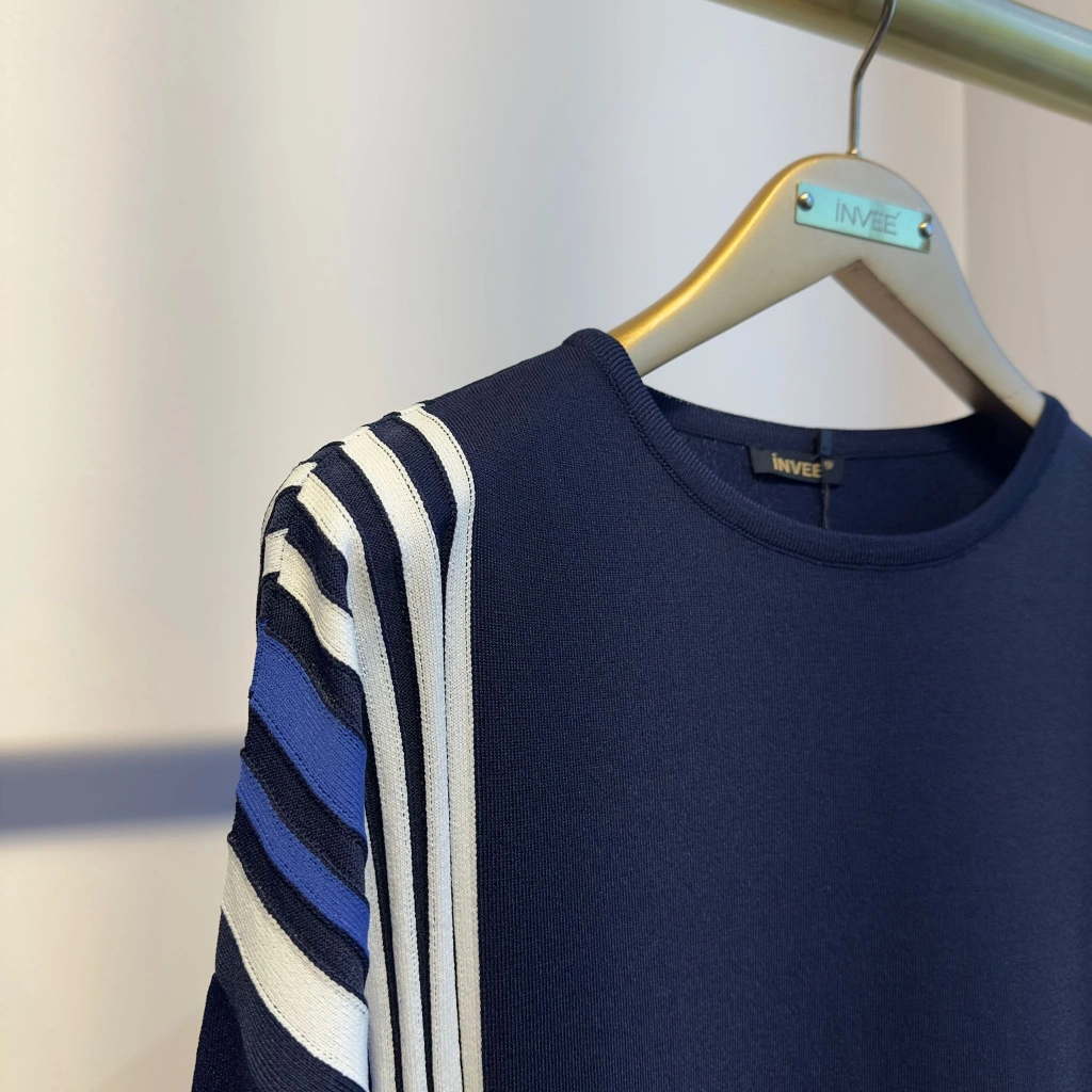 Modern ve rahat çizgileriyle öne çıkan bu lacivert triko tunik, sade şıklığı ve konforu bir araya getiriyor. Yumuşak dokulu kumaşı sayesinde gün boyu rahat bir kullanım sunarken, etek ve kol uçlarındaki siyah–kırmızı çizgi detayları tasarıma dinamik bir dokunuş katıyor.