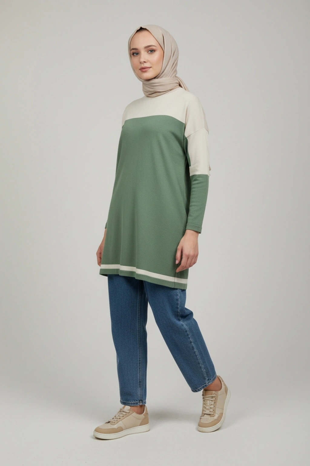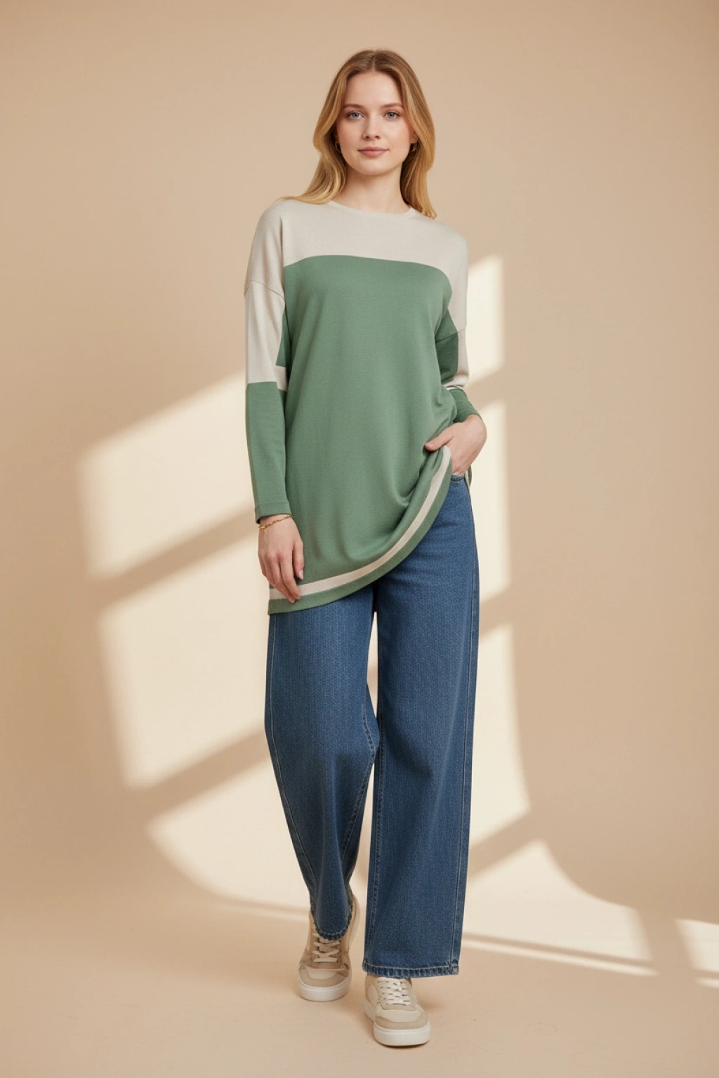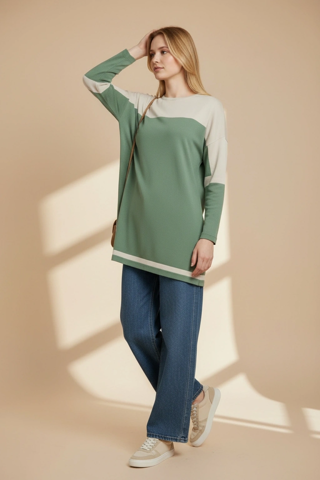 Modern renk blok tasarımıyla öne çıkan bu uzun tunik, sade şıklığı güçlü bir duruşla birleştiriyor. Kontrast geçişli üst panel detayı modele hareket katarken, düz ve akıcı kesimi sayesinde rahat bir kullanım sunar.