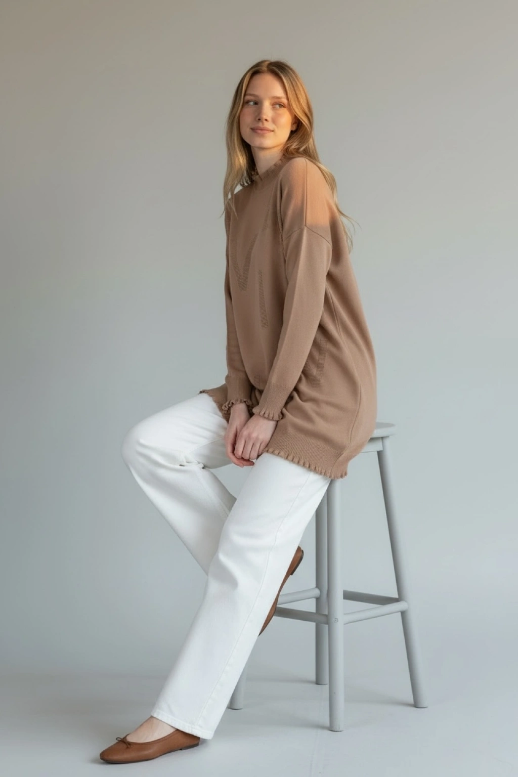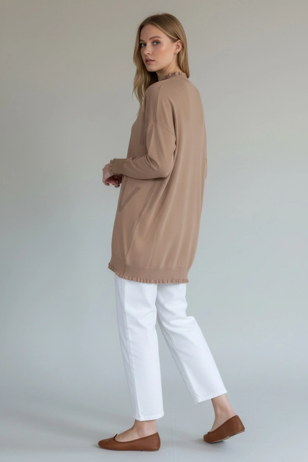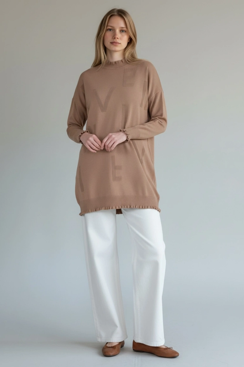 Modern tasarımıyla öne çıkan yazı detaylı triko tunik, günlük kombinlere dinamik ve şık bir görünüm kazandırır. Ön yüzeyindeki kabartma yazı dokusu modele hareket katarken, yumuşak dokulu triko kumaşı sayesinde gün boyu konfor sağlar. Yaka, kol ucu ve etek ucundaki hafif fırfır detayları tasarıma zarif bir dokunuş ekler.