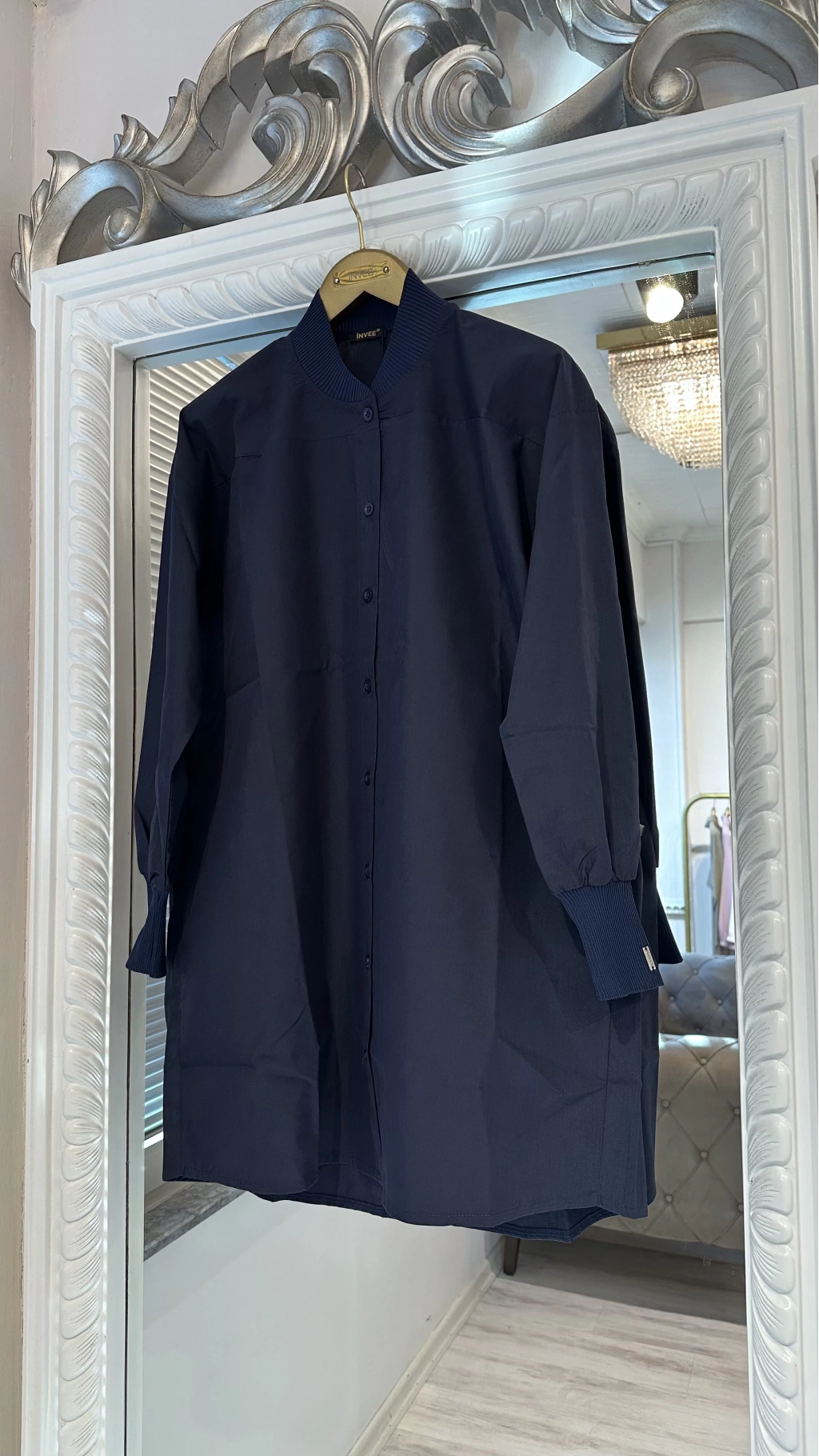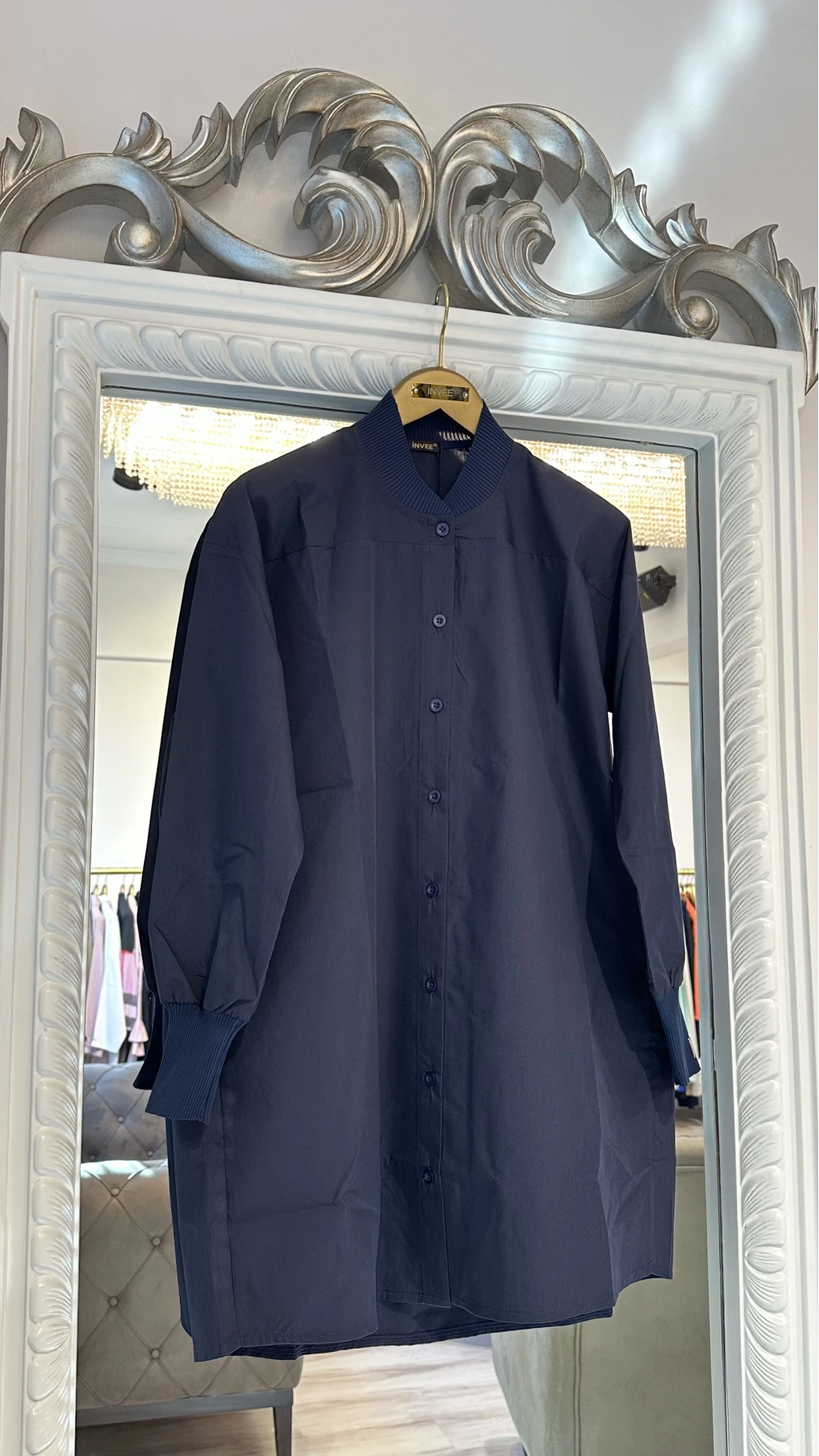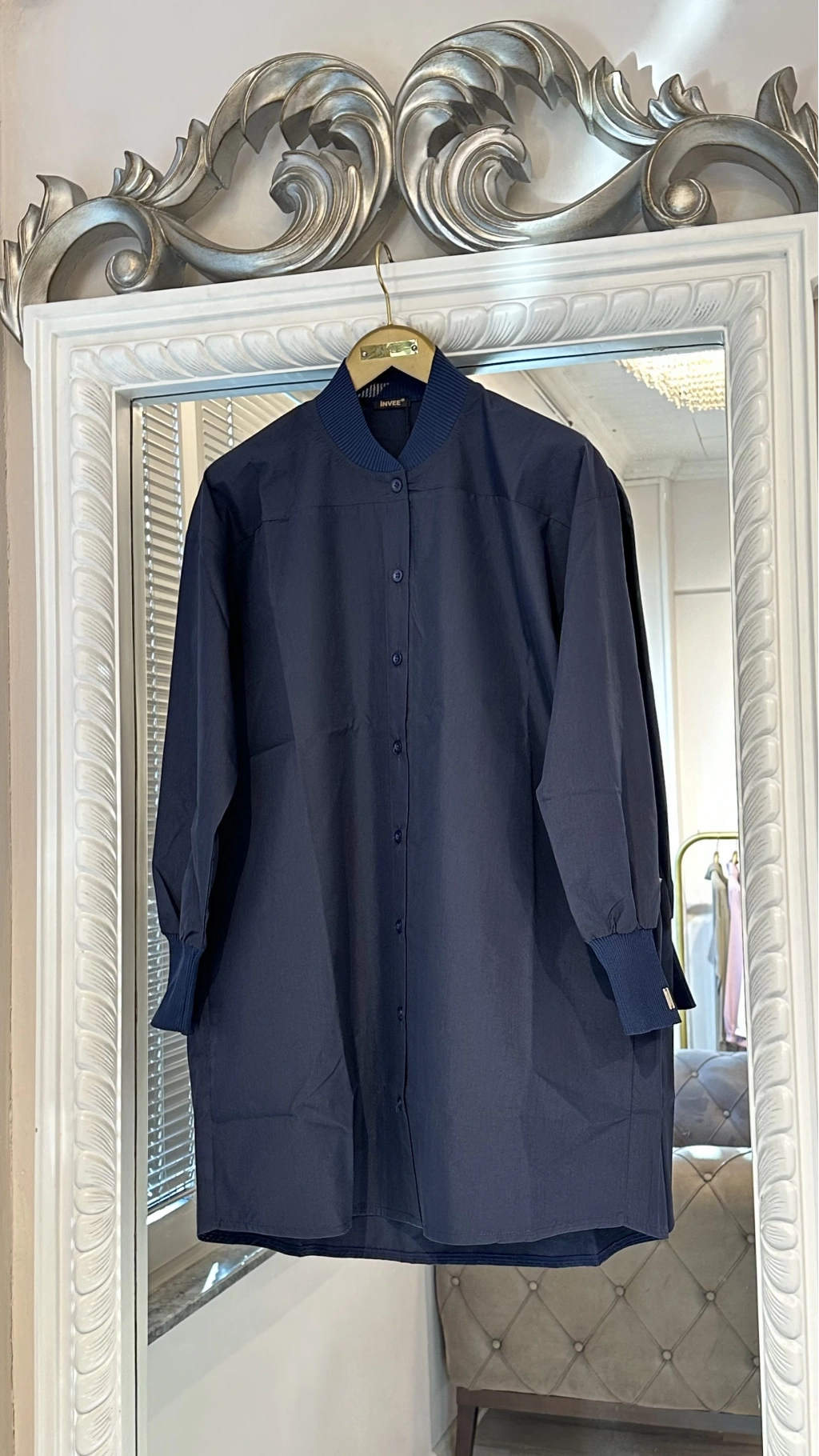 Zamansız şıklığın en sade haliyle buluştuğu bu lacivert oversize uzun gömlek, modern kesimi ve sade detaylarıyla her stile kolayca uyum sağlar. Düz formu, dökümlü duruşu ve ribana yaka detayı sayesinde klasik gömlek formuna sportif bir dokunuş kazandırır.