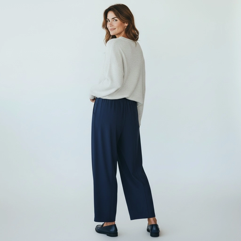 Geniş paça formu, bacakları olduğundan daha uzun ve dengeli gösterirken; hafif yapısı pantolonu dört mevsim kullanıma uygun hale getirir. Yumuşak dokusu ve sade görünümü, kombininizi zahmetsizce şık bir noktaya taşır.