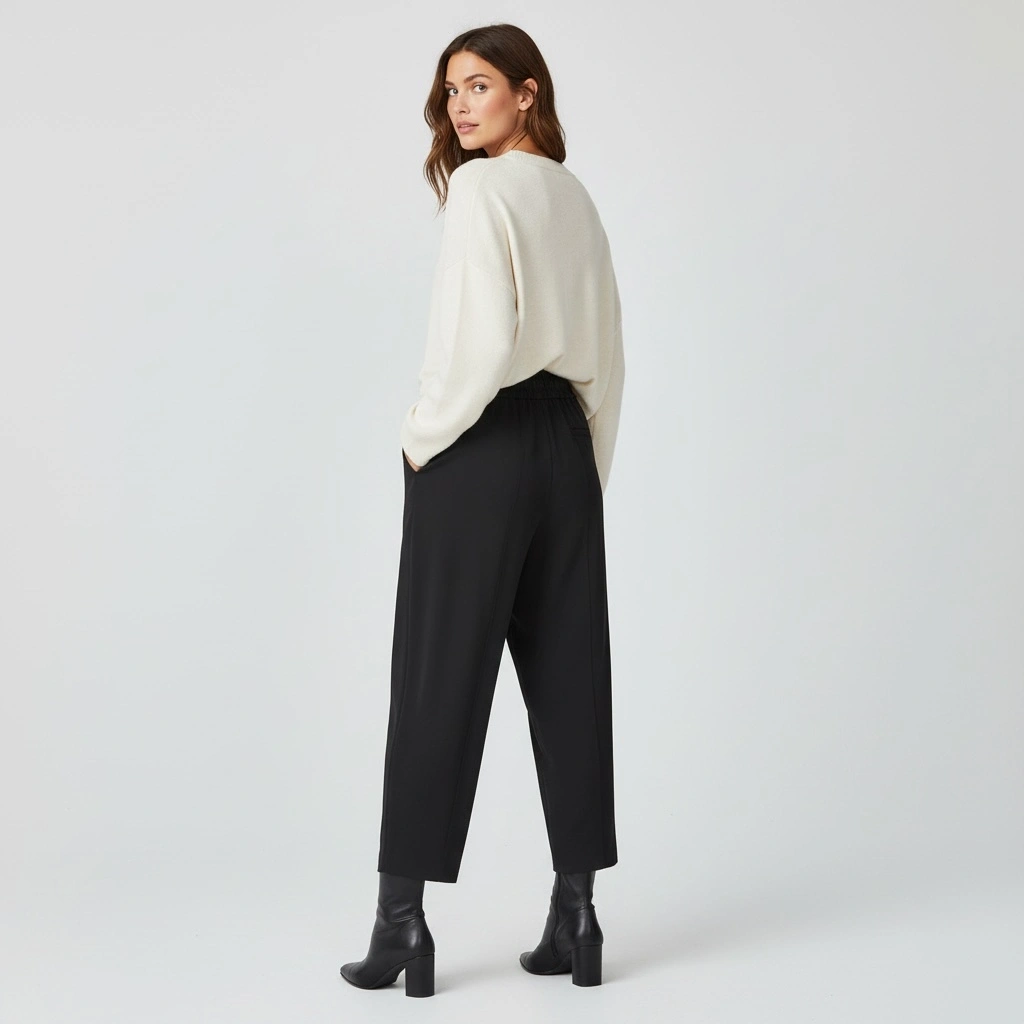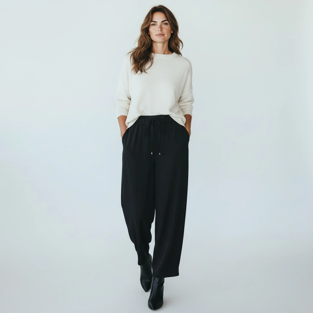 Geniş paça formu, bacakları olduğundan daha uzun ve dengeli gösterirken; hafif yapısı pantolonu dört mevsim kullanıma uygun hale getirir. Yumuşak dokusu ve sade görünümü, kombininizi zahmetsizce şık bir noktaya taşır.