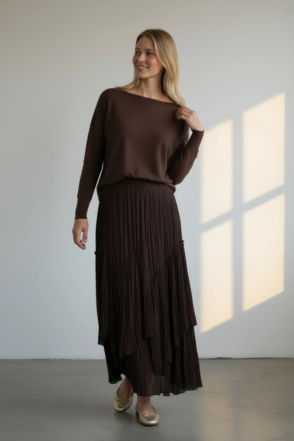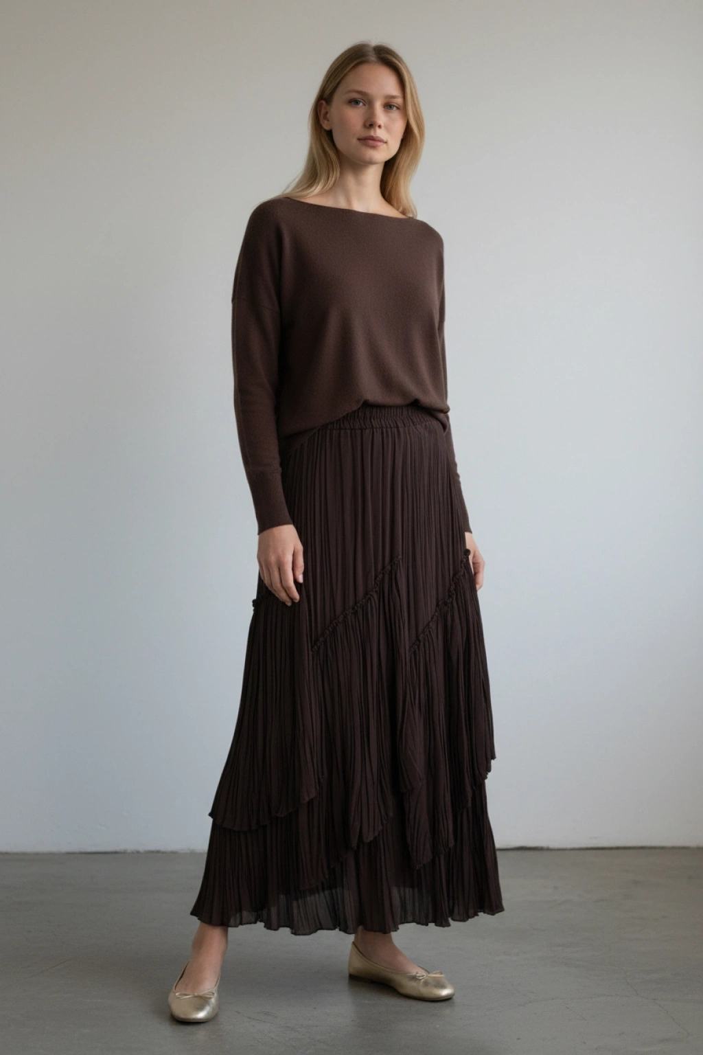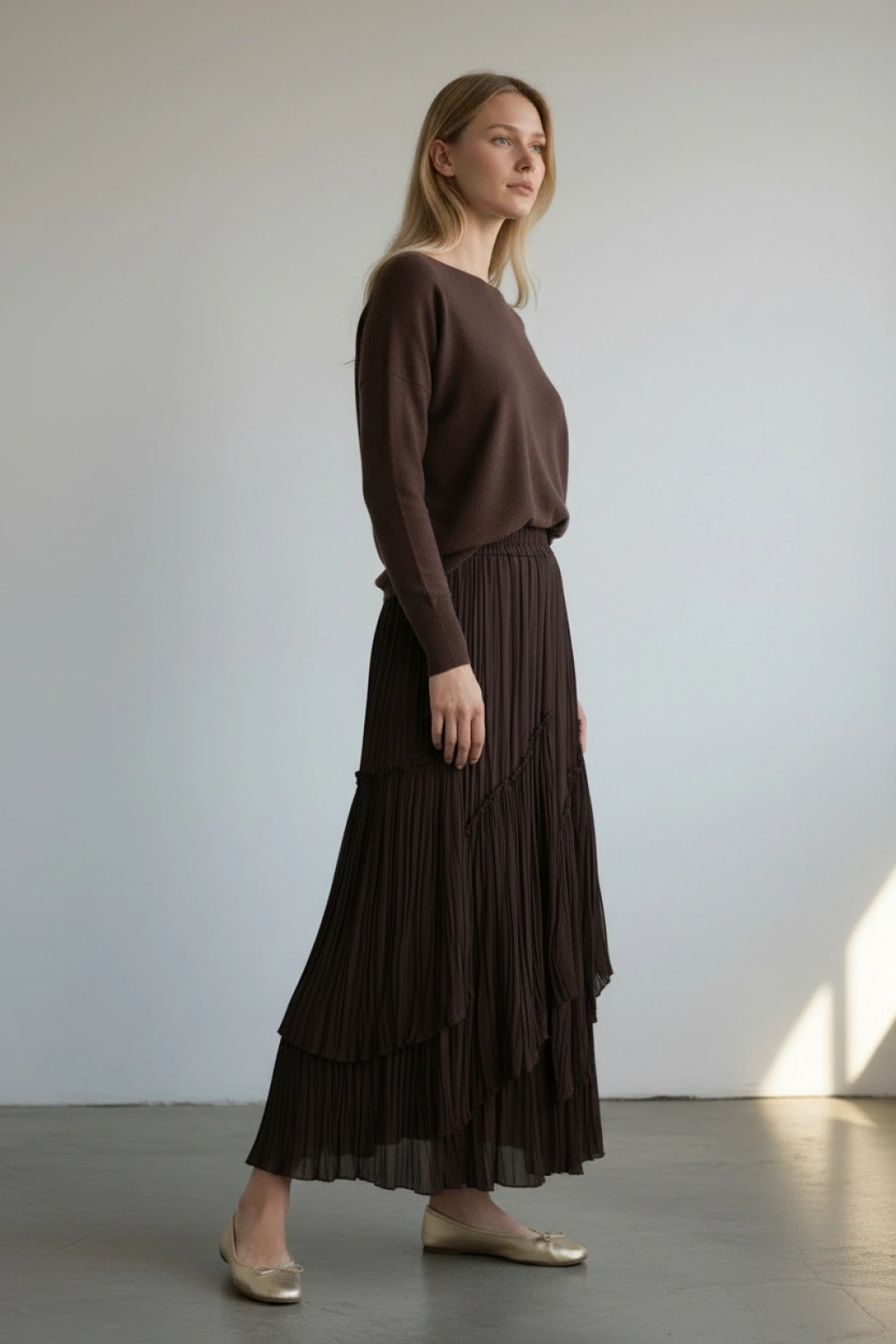 Zarif ve feminen bir görünüm sunan uzun şifon etek, katlı ve piliseli yapısıyla hareketli bir duruş kazandırır. Hafif ve akışkan kumaşı sayesinde gün boyu konfor sağlar.