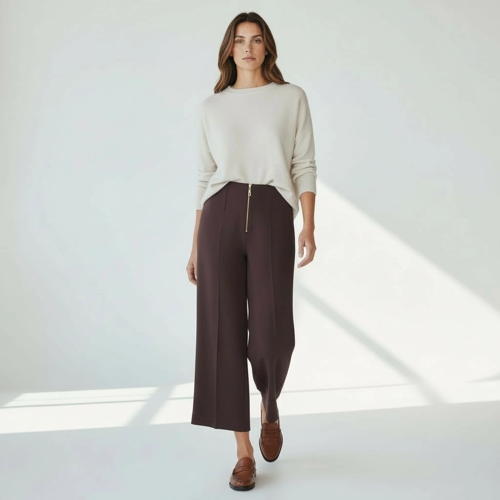 Minimalist şıklığı modern bir çizgiyle buluşturan bu pantolon, özel kesimi ve zarif detaylarıyla gardırobunuzun anahtar parçalarından biri olmaya aday. Geniş paça formu, rahat hareket özgürlüğü sunarken aynı zamanda güçlü ve sofistike bir silüet oluşturur. Bel bölümündeki dikkat çekici altın renk fermuar detayı, tasarıma modern bir dokunuş katarak sade görünümünü stil sahibi bir ifadeye dönüştürür.