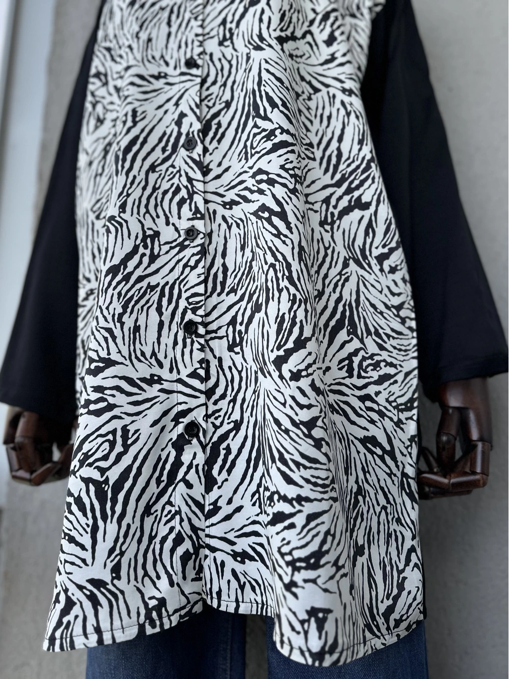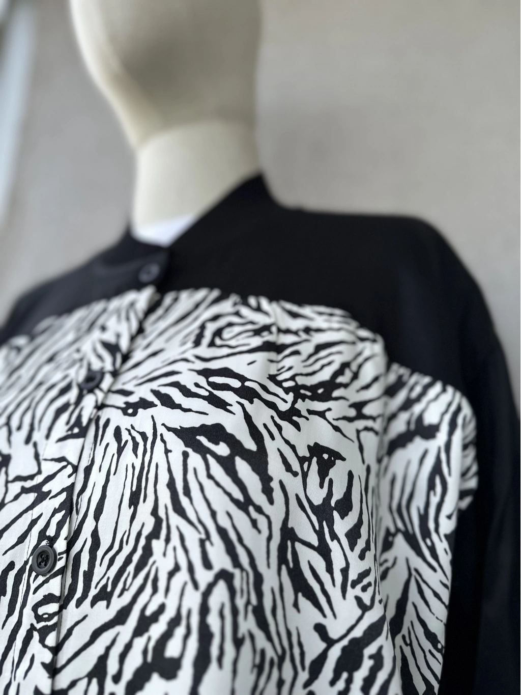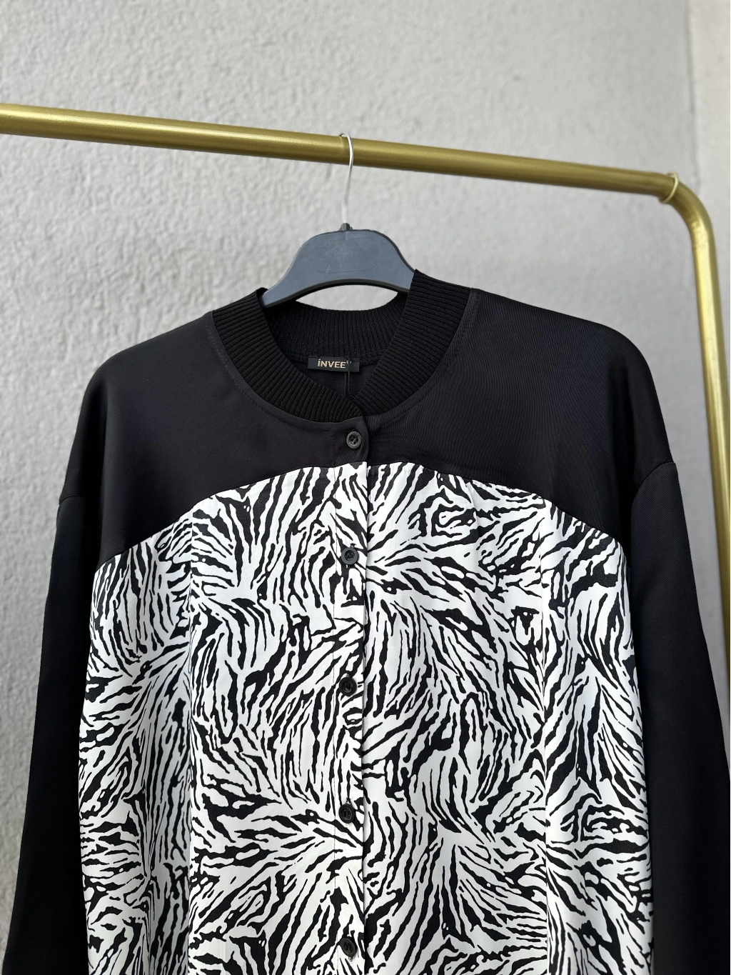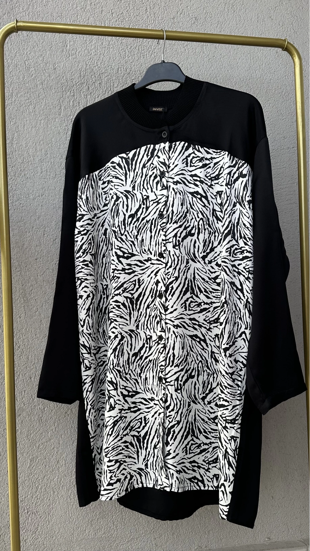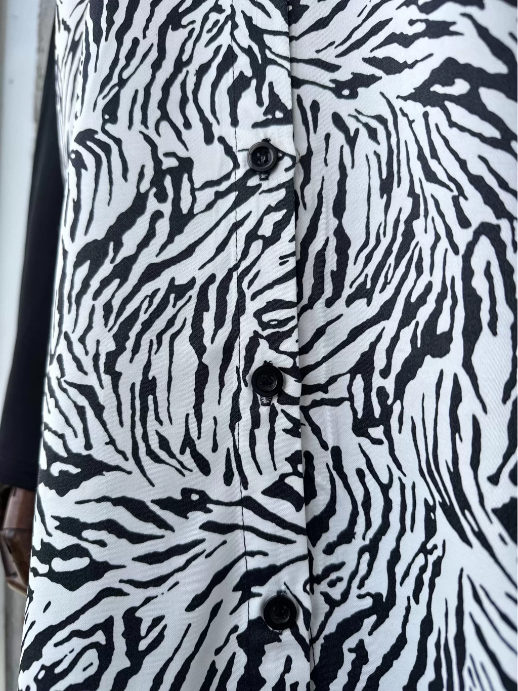 Zamansız şıklığın en sade haliyle buluştuğu bu zebra desen oversize uzun gömlek, modern kesimi ve sade detaylarıyla her stile kolayca uyum sağlar. Düz formu, dökümlü duruşu ve ribana yaka detayı sayesinde klasik gömlek formuna sportif bir dokunuş kazandırır.